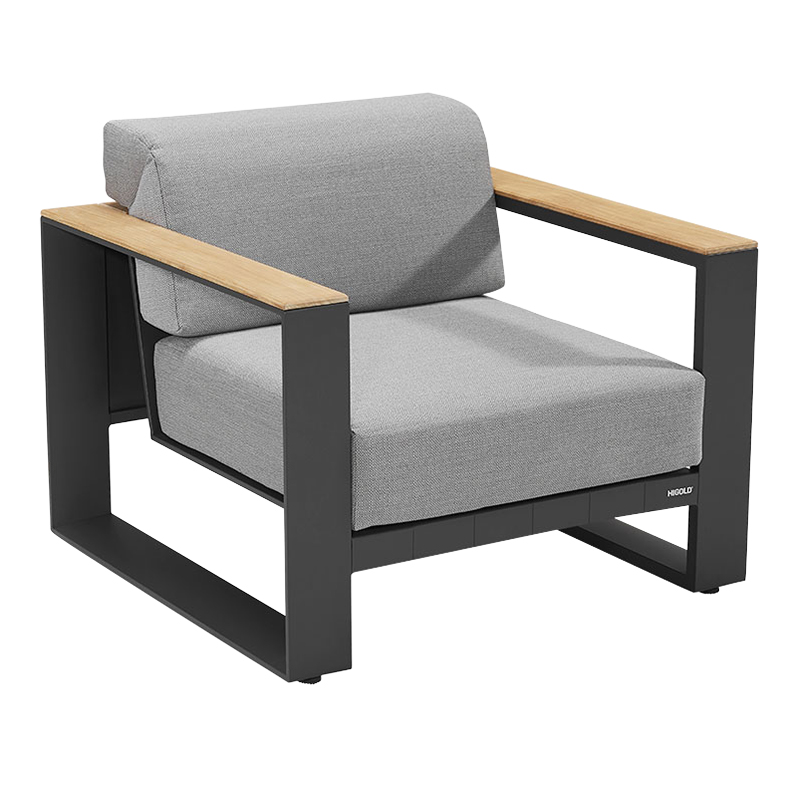 The Cambusa Lounge set from Higold is an elegant set that consists of a three-seater lounge sofa, two lounge chairs and a coffee table with a teak top. Higold Excellent Outdoor is known for the use of high-quality materials and unique designs. You immediately recognize Higold’s design DNA in the Cambussa collection. These outdoor furniture pieces form a real designer set and offer seating for five people. In this design it was decided to combine sleek lines with rounded shapes in the cushions. This gives the Cambusa Lounge set a contemporary look and fits into different garden styles. The sofa and chairs offer a high level of seating comfort, guaranteeing optimal enjoyment!