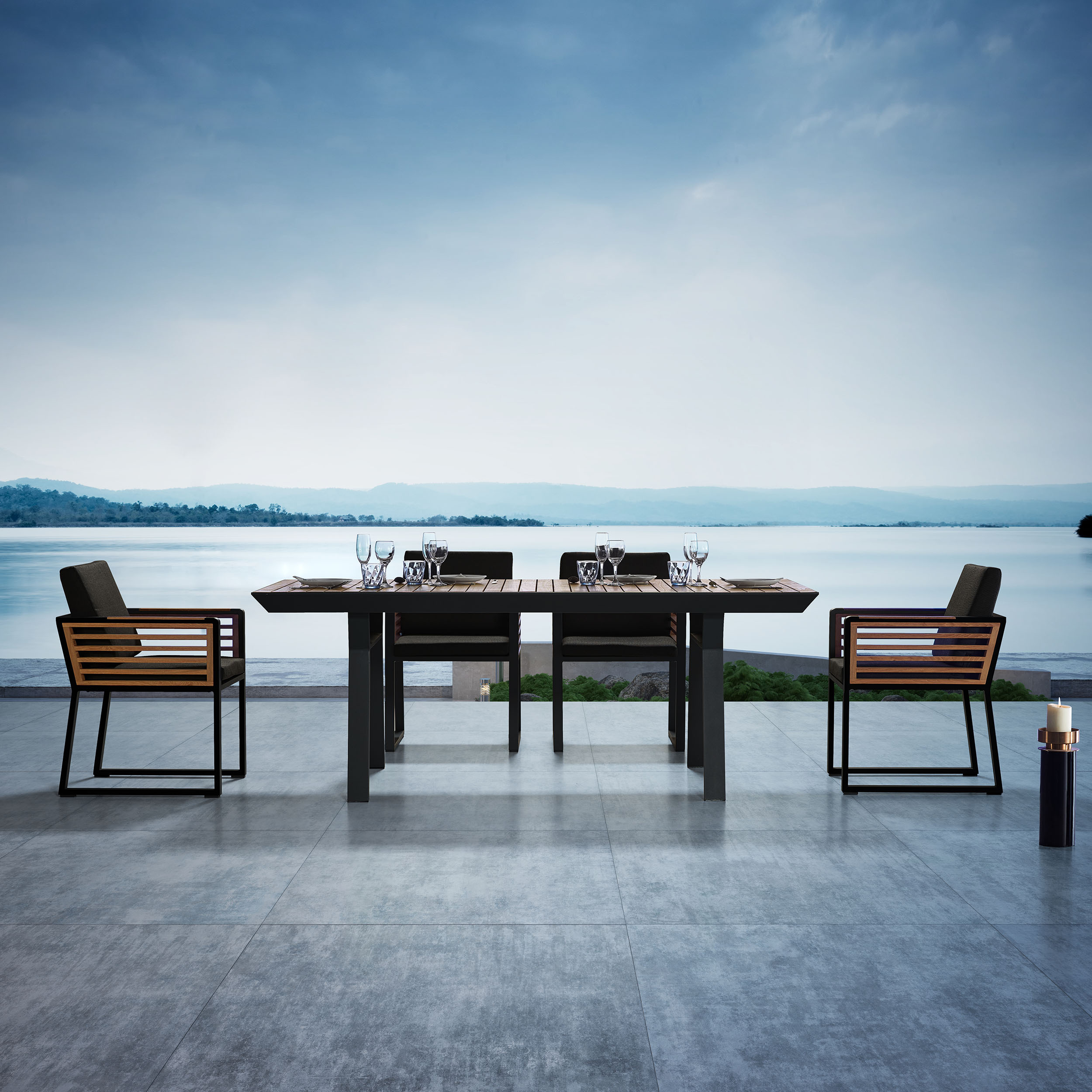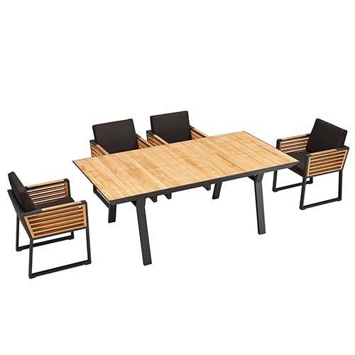 This New York dining set is known for its comfort and modern design. The dining set has a sturdy anthracite aluminium frame, sturdy teak elements in the armrests and as a table top and lovely thick cushions made of Olefin. Olefin is a very strong material and is known for its comfort. Dirt and UV radiation have no effect on the quality and in addition the cushions are hardwearing and feel wonderfully soft.