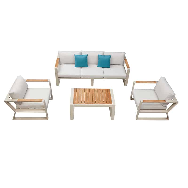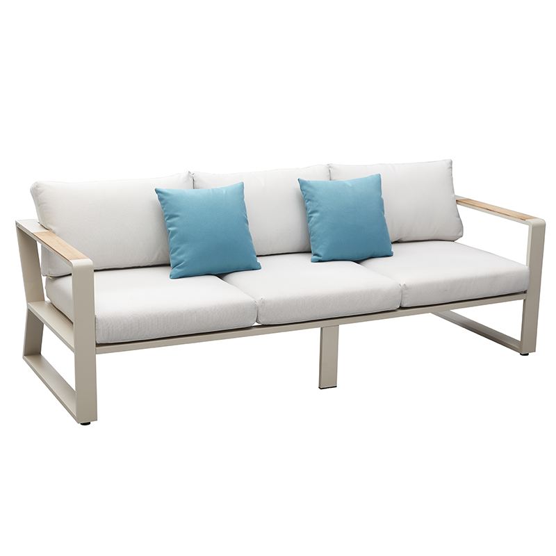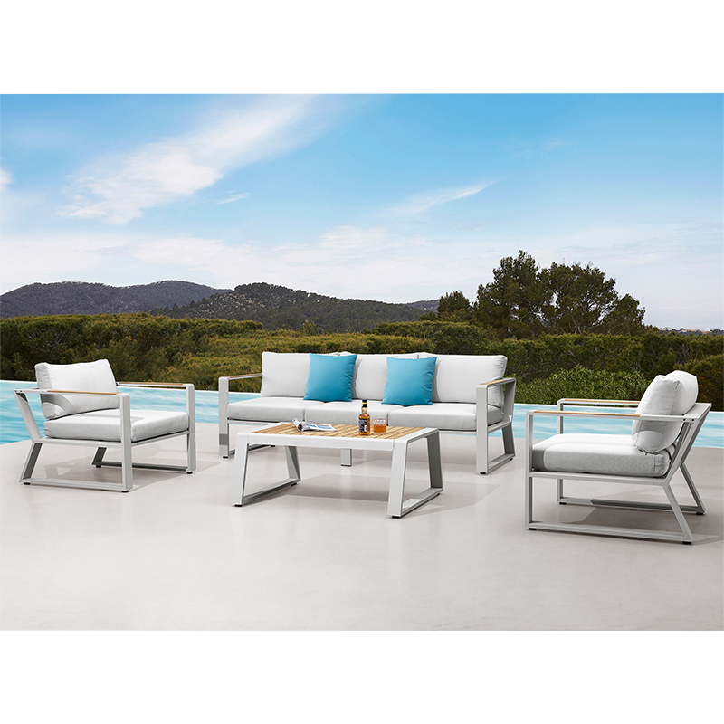 This lounge set consists of a lounge sofa (three-seater), two lounge chairs and a stylish coffee table. These stylish outdoor furniture pieces feature a taupe-coloured powder-coated aluminium frame. Thanks to this choice of material, the frame is lightweight but very sturdy. The powder coating also ensures that the frame is scratch-resistant and low-maintenance. Both the table top and the details on the armrests are teak. Thick white Olefin cushions are placed in the lounge sofa and chairs. Olefin is a strong, dirt-repellent and UV-resistant material. As a result, the cushions are hard-wearing and feel nice and soft! The Exee Lounge Set is therefore suitable for professional outdoor use.