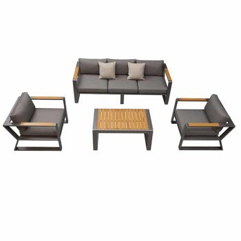 The Exee 2.0 Lounge Set from Higold is an elegant set consisting of a three-seater lounge sofa, two lounge chairs and a coffee table with a teak top. Higold Excellent Outdoor is known for using high-quality materials and unique designs. In the Exee collection, you will immediately recognise Higold’s design DNA. Exee comes from the word ‘Excellent’. These outdoor furniture pieces form a true designer set and offer seating for five people. In this taupe-coloured design, the choice was made to combine corners with rounded shapes. This gives the Exee 2.0 Lounge Set a contemporary look and fits within different garden styles. The sofa and chairs offer high seating comfort, guaranteeing optimal enjoyment!