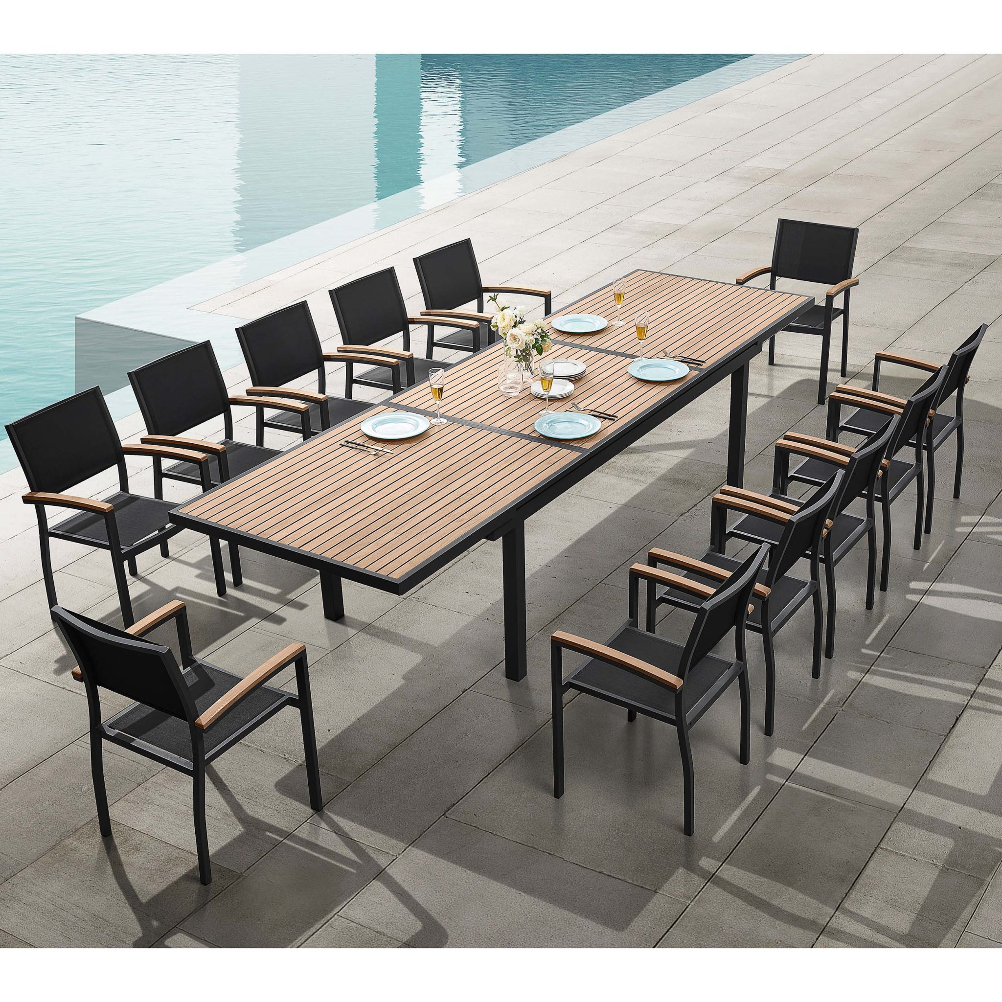 This 13-piece dining set consists of: 1 extendable dining table and 12 dining chairs.