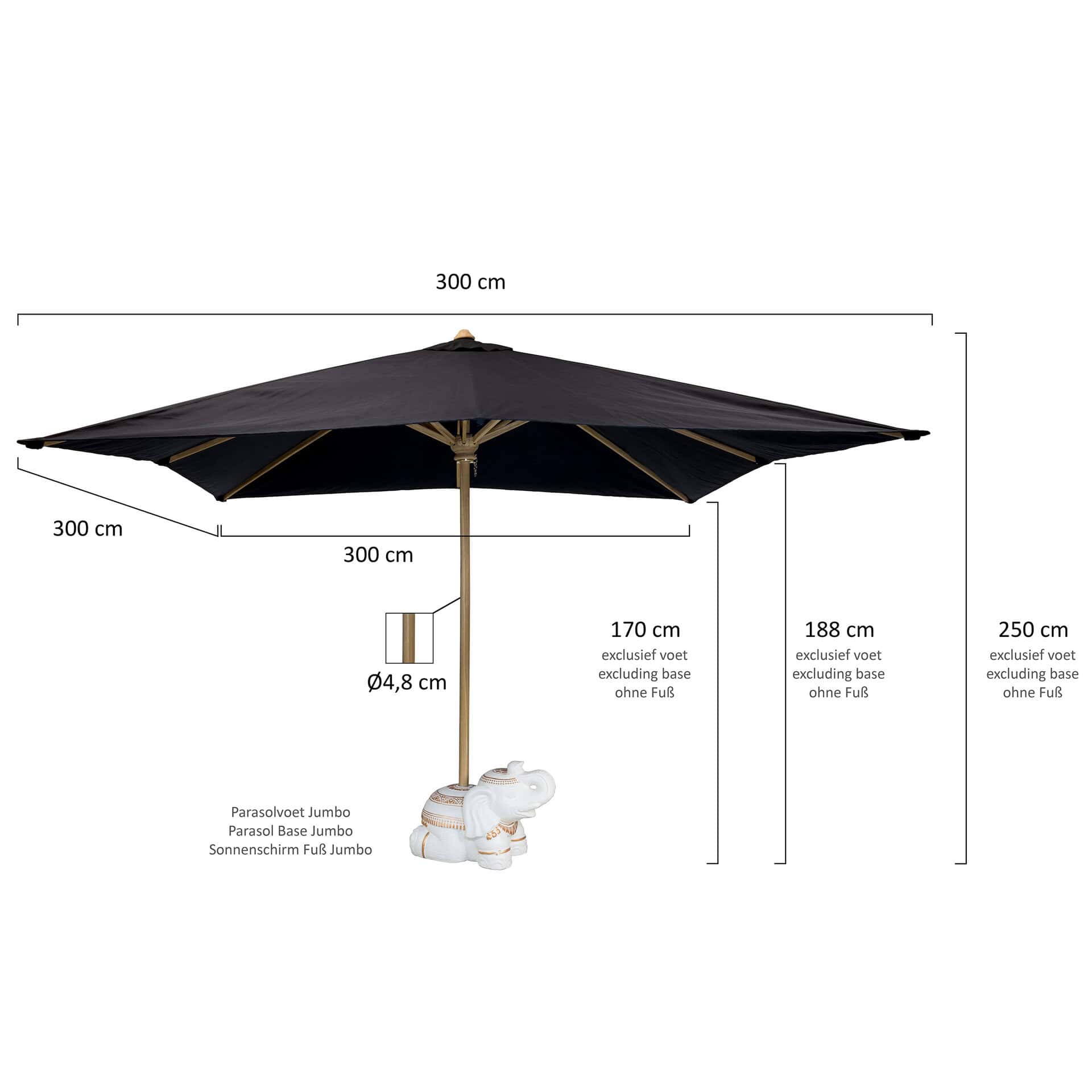 The parasol has a sturdy teak frame with a tube diameter of 48 mm, ensuring stability and durability. The total height is 250 cm (without parasol base) with a clearance height of 188 cm at the highest point and 170 cm at the lowest point, allowing guests to sit comfortably under the parasol.