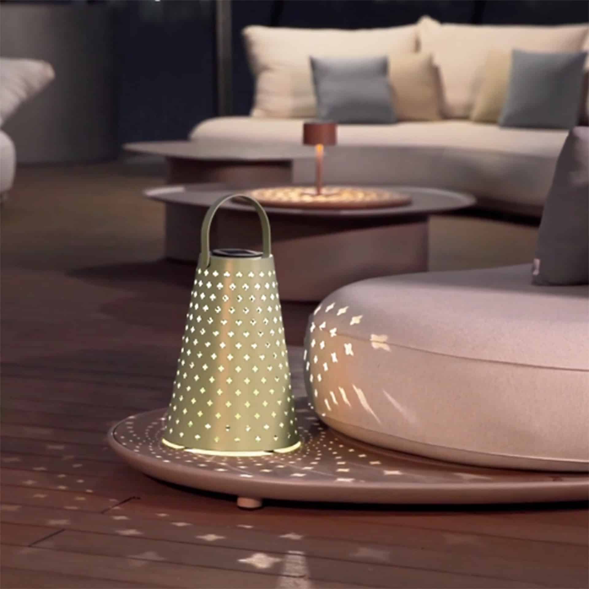 The Luna lamp creates a distinctive lighting effect through its unique design. Light shines through the perforated aluminum and casts playful patterns on your terrace or walls. This creates a warm, inviting atmosphere. You don’t need to worry about exact lumen output, as this lamp is designed for ambient lighting rather than primary illumination. Therefore, combine multiple Luna lamps to evenly light your space. The light has a warm color temperature that perfectly suits cozy hospitality environments where guests want to relax.