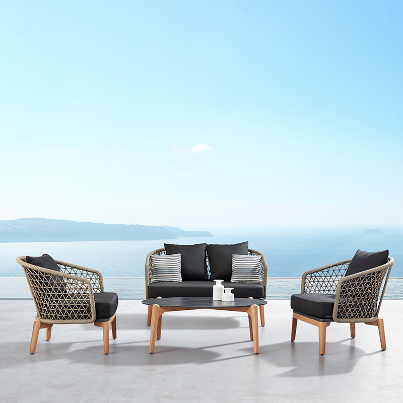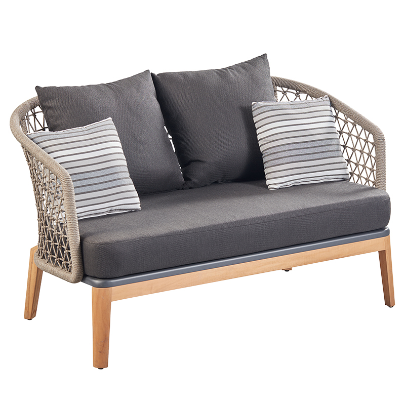 The Maple Lounge Set consists of a comfortable two-seater lounge sofa, two lounge chairs and a coffee table. The grey rope weave of the lounge chairs and sofa is UV-resistant and therefore low-maintenance. The chairs and table have sturdy solid teak legs. The Maple Lounge Set comes with thick Olefin cushions. These provide hours of seating comfort. Top quality catering quality!
