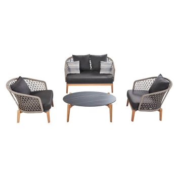 The Maple Lounge Set from Higold is a stylish set with airy design. Higold Excellent Outdoor is known for using high-quality materials and unique designs. This lounge set consists of a two-seater sofa, two lounge chairs and a coffee table with stone top. The airy rope weave gives this four-piece set a natural look. The grey colour adds to this look. The Maple Lounge Set comes with a table and thick cushions. Practical and very comfortable!