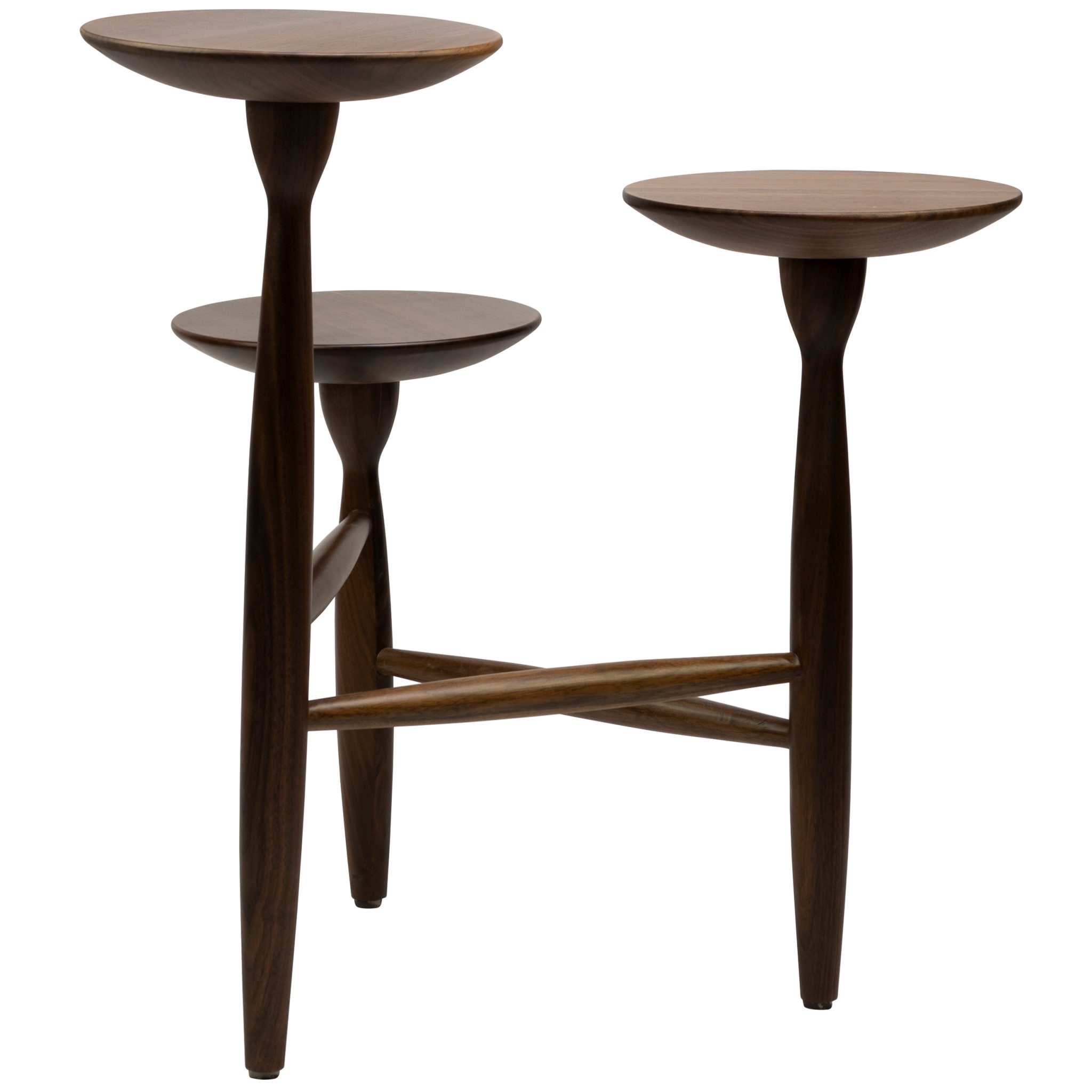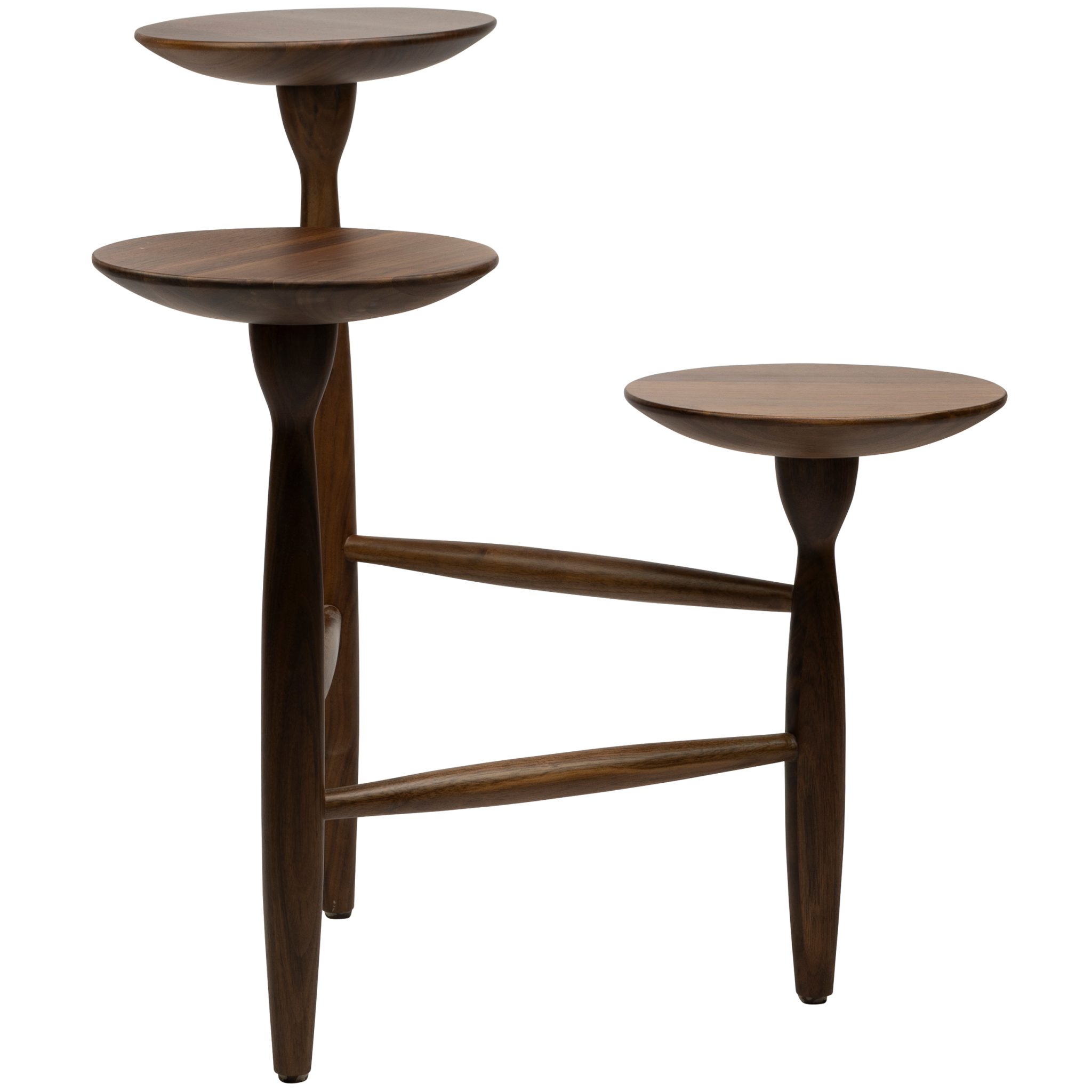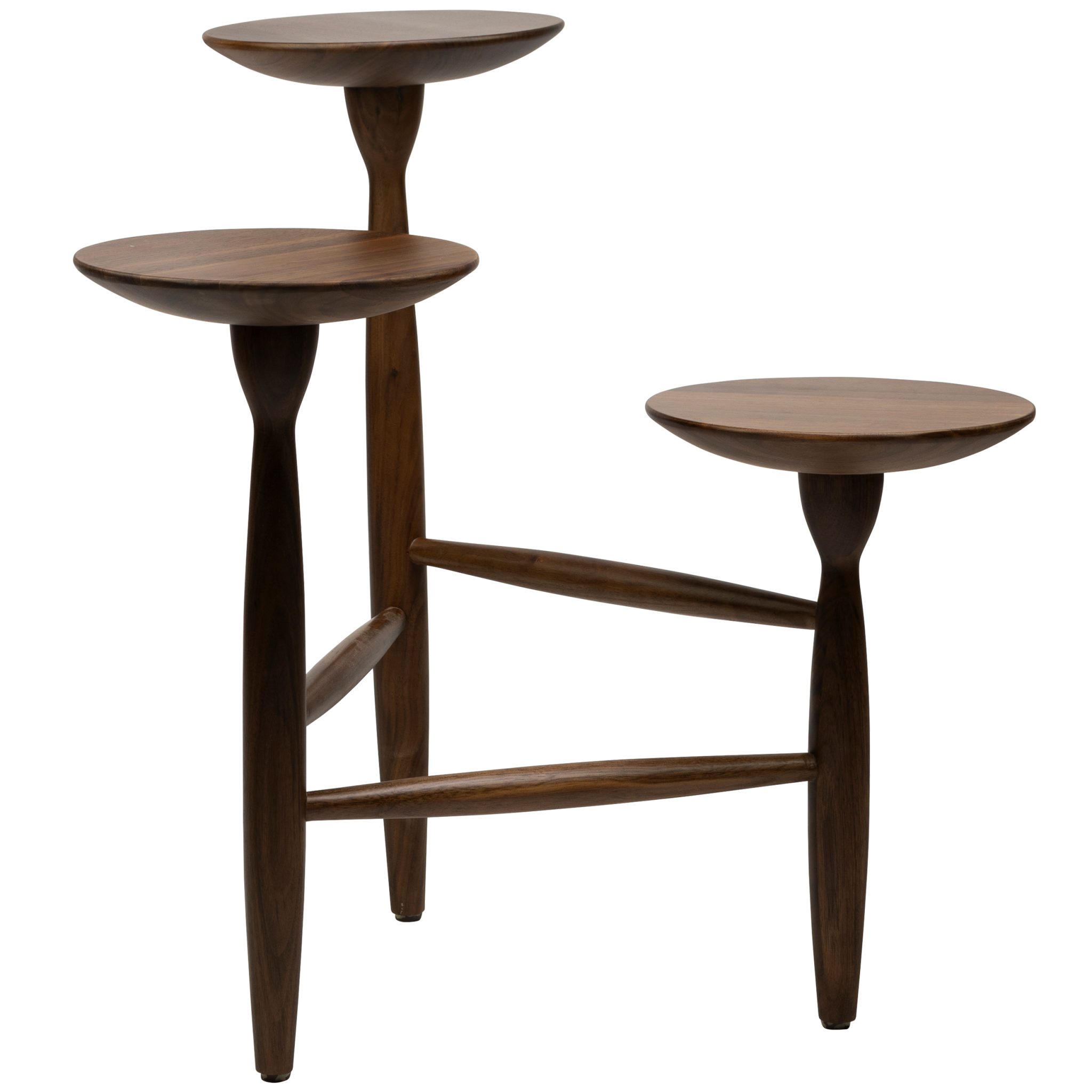 Side table Muffin is made of strong and robust walnut wood, which gives the plant holder a botanical and natural look. The 3 shelves at different heights ensure playfulness in your hospitality interior.