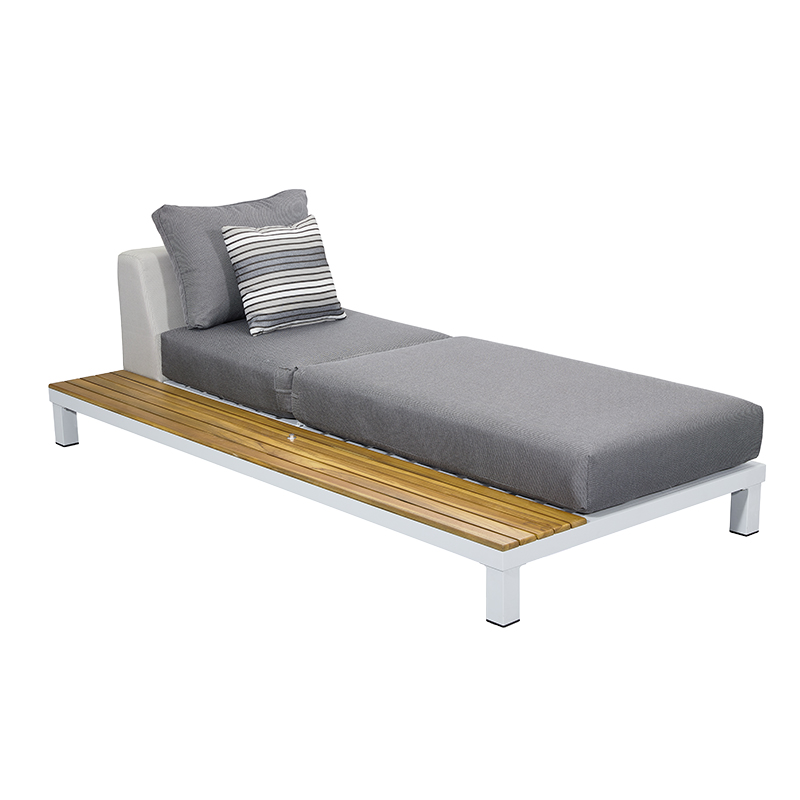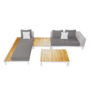 The Polo 2.0 Corner Lounge by Higold is a modular lounge set consisting of two sofa elements and two teak coffee tables. Higold Excellent Outdoor is known for using high-quality materials and unique designs. The Polo 2.0 Collection is characterised by clean lines, a sturdy white aluminium frame, teak elements and comfortable cushions. The elements can be combined with each other. The teak table can be slid between the left and right lounge section. The left lounge element is also height-adjustable. Practical and something for everyone! The warm colour of the teak and the cool grey cushions give the Polo 2.0 Corner Lounge a stylish look.