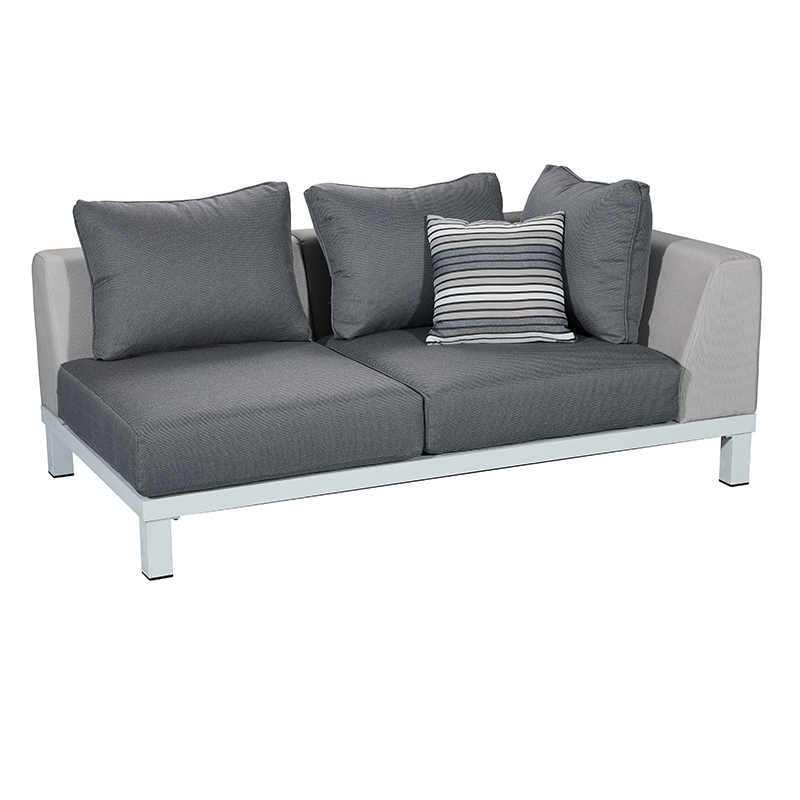 This handy and trendy corner lounge consists of a left and right sofa element and two sturdy coffee tables. In the design of this set, powder-coated white aluminium provides a solid base. Thanks to the powder coating, the frame is scratch-resistant and low-maintenance. The left lounge section is easily adjustable in height. High-quality slatted teak has been chosen for both the side of the lounge and the table top. The cushions are upholstered in grey Olefin, which are filled Quick Dry Foam. This makes the set perfect for professional outdoor use!
