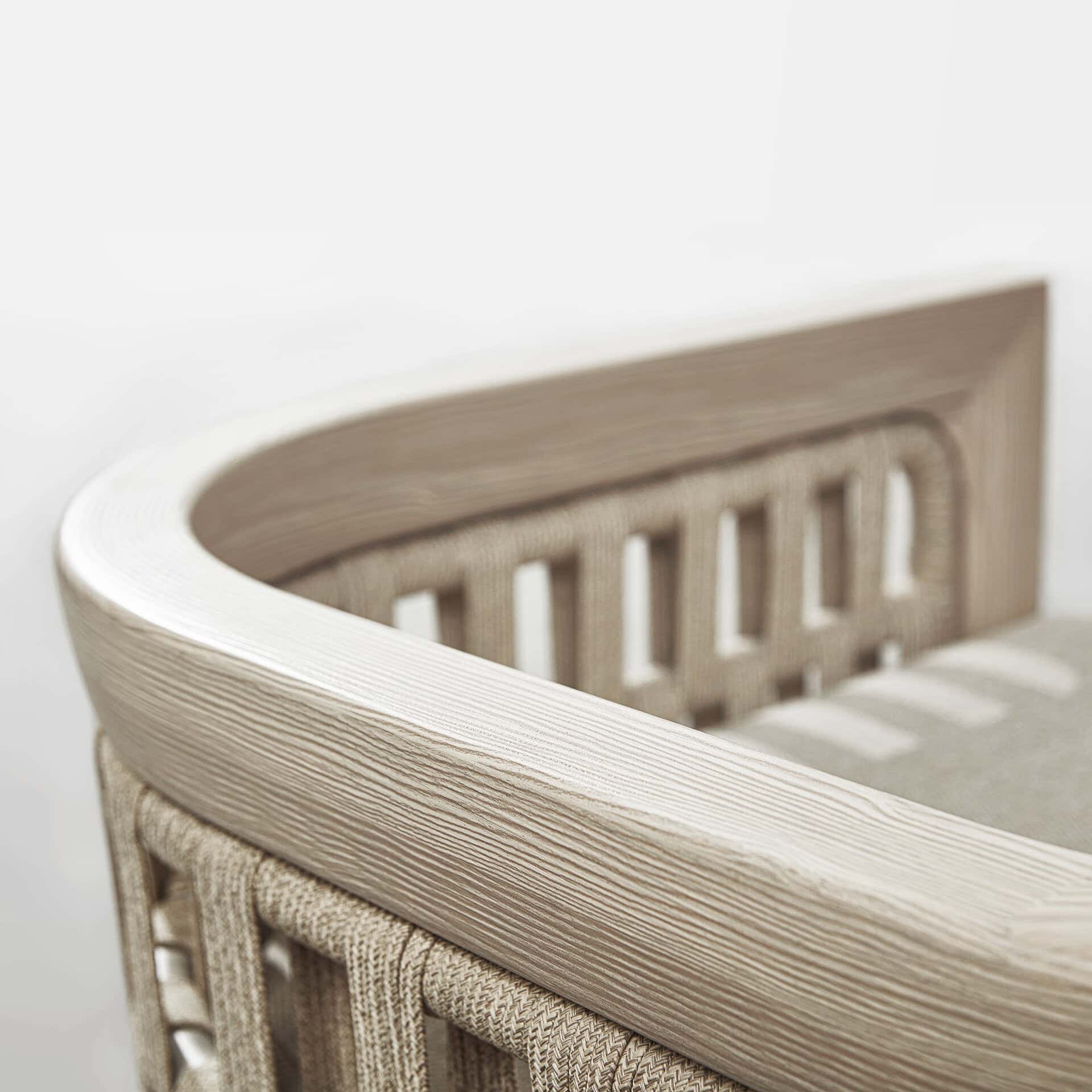 The expertly crafted weave in natural taupe and brown tones not only creates a warm, inviting atmosphere but also offers practical benefits. The wood-weave material is UV-resistant and retains its colour even after years of intense sunshine on a hotel terrace.