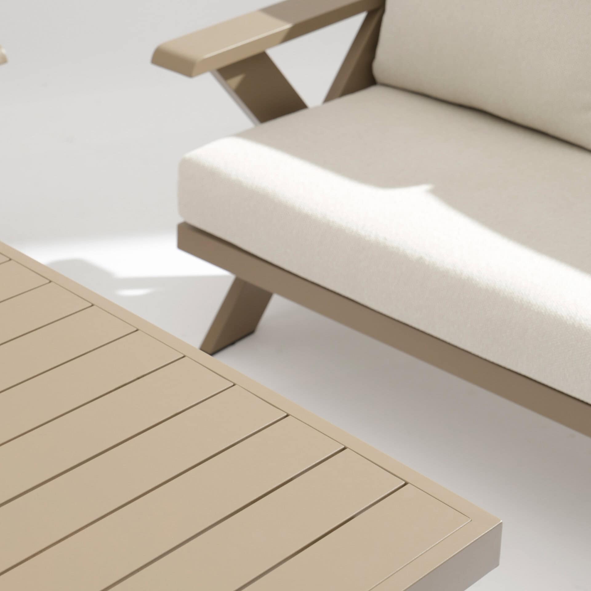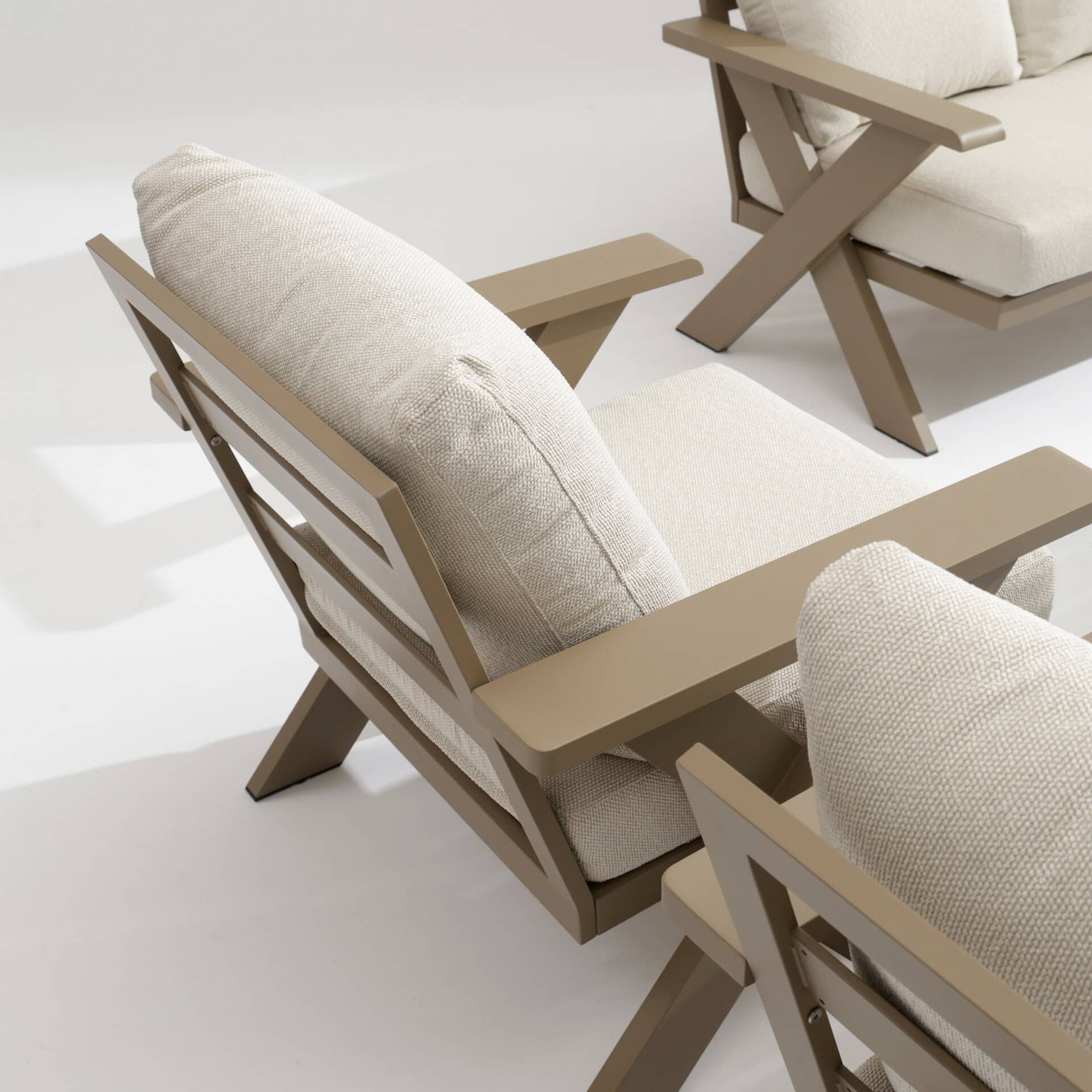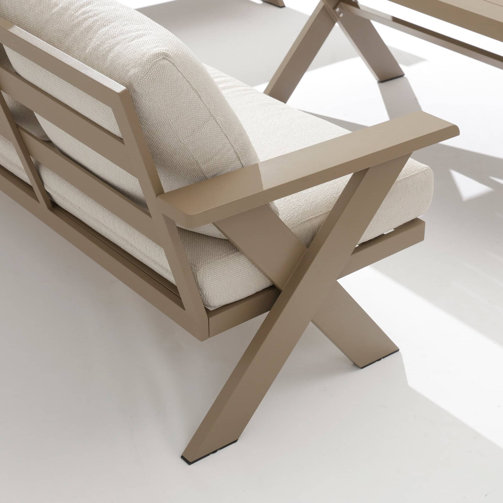 The Satori Lounge Set features a sturdy aluminum frame in a champagne color. Aluminum does not rust and can withstand all weather conditions with ease.