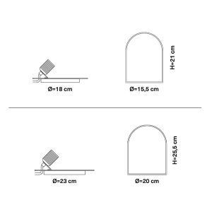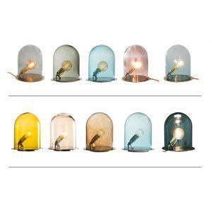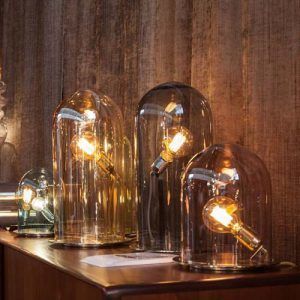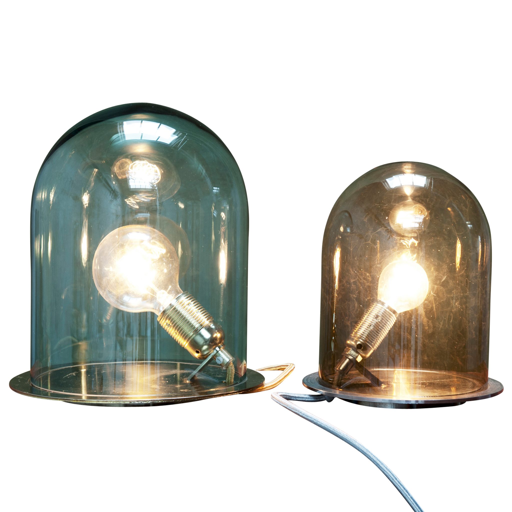 Table lamp Glow in a Dome is available with a silver or brass base, with glass domes in colors from smokey gray to olive and golden smoke. The table lamp is available with a diameter of 18 or 23 cm.