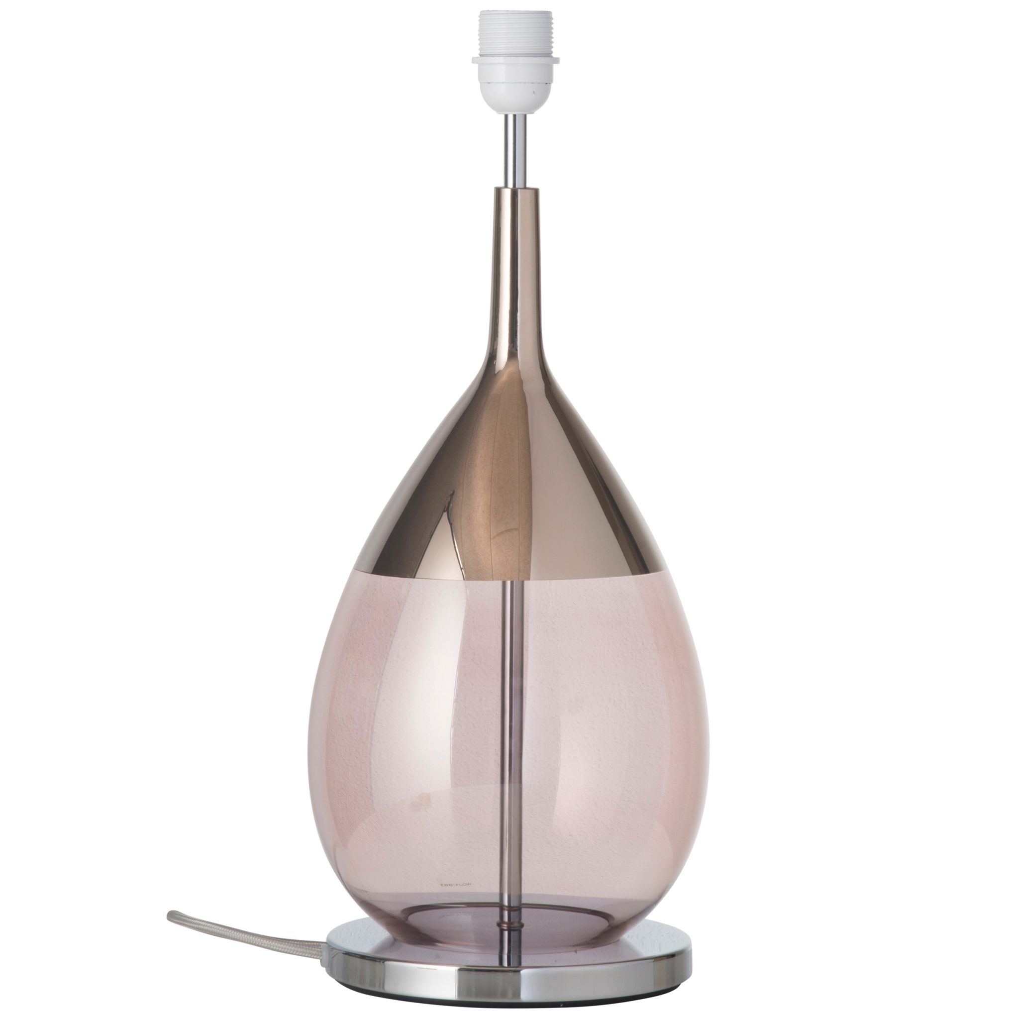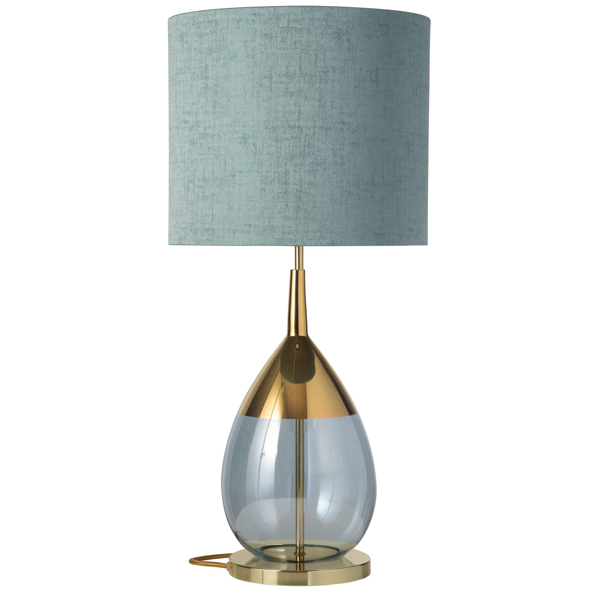 The Lute table lamp is characterized by its mouth-blown glass and metal foot. The Lute table lamp base is made in a tube shape with a gold or silver base and the glass in a clear or rust color. The lamp requires an input voltage of 120 volts to power the lamp.