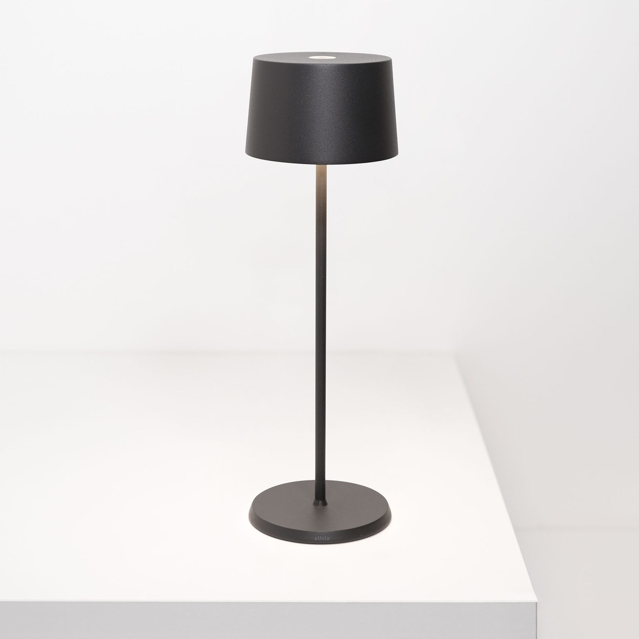 Olivia is a portable and rechargeable table lamp that runs on batteries. The table lamp is equipped with a dimmer touch control, a dimmer memory function that adjusts the light intensity and stores the dimming steps in memory. Consequently, each time the lamp is turned on, the light intensity will match the previously set light intensity. You can charge the lamp with the charging base for the Ofelia & Olivia.