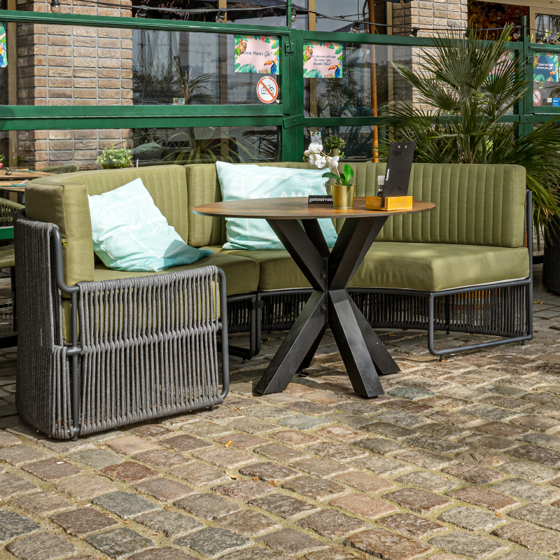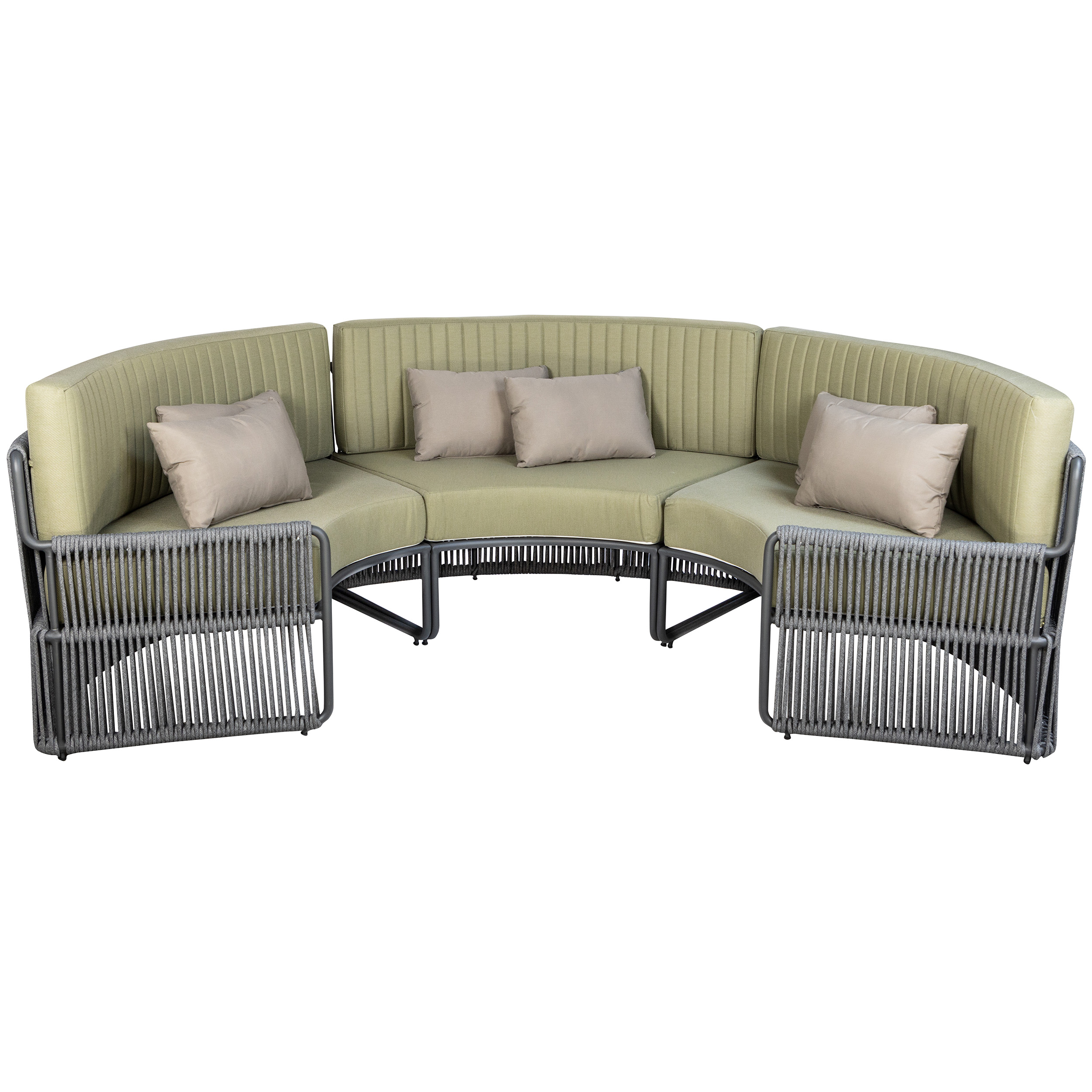 The Roma Lounge Sofa Small consists of three sofa elements that together form a cozy semi-circular seat. These elements have a sturdy powder-coated aluminum frame. The powder coating makes the frame scratch-resistant and low-maintenance! The Roma Lounge sofa comes with thick cushions covered with green Olefin upholstery. This fabric feels wonderfully comfortable, is UV-resistant and dirt-repellent. Perfect for professional use!