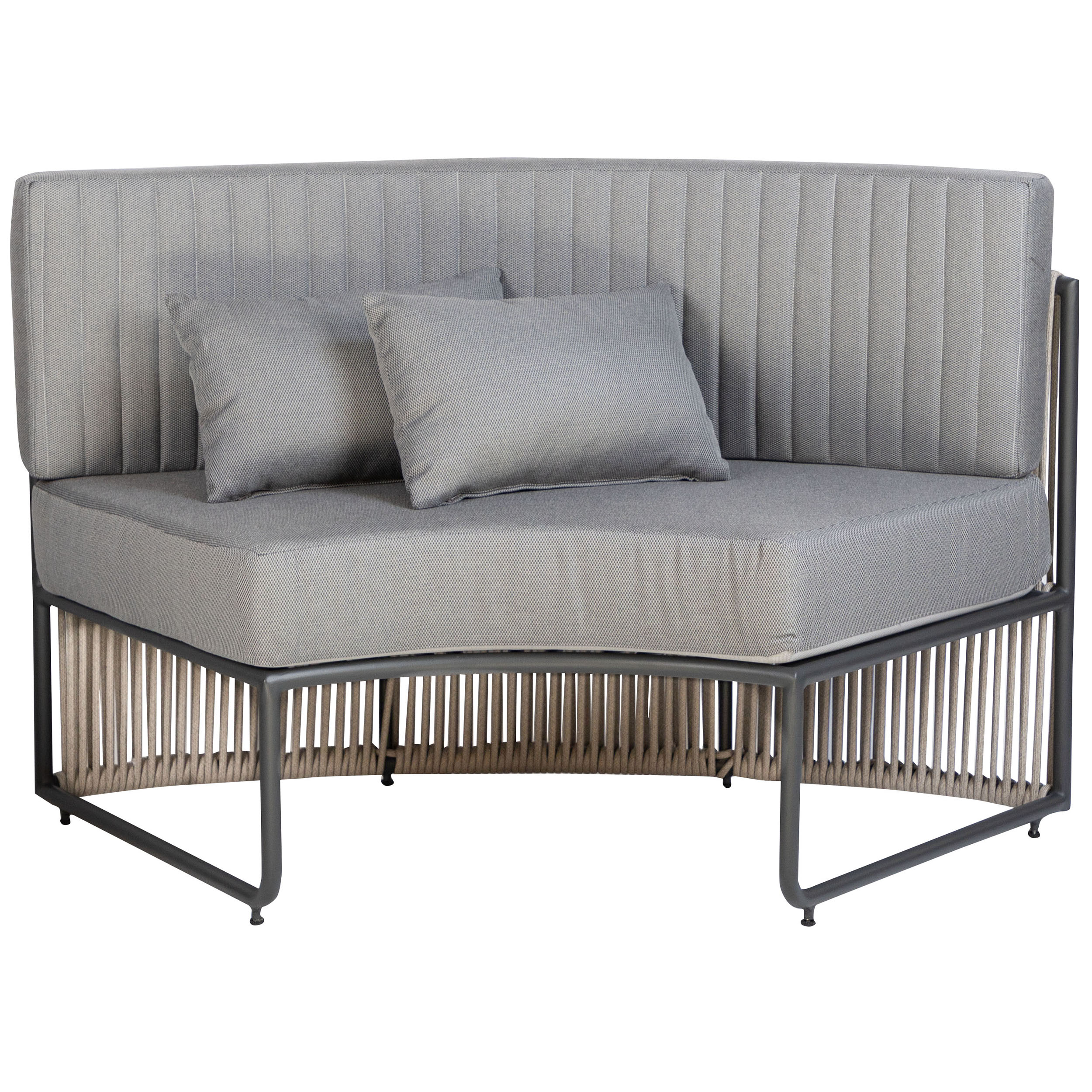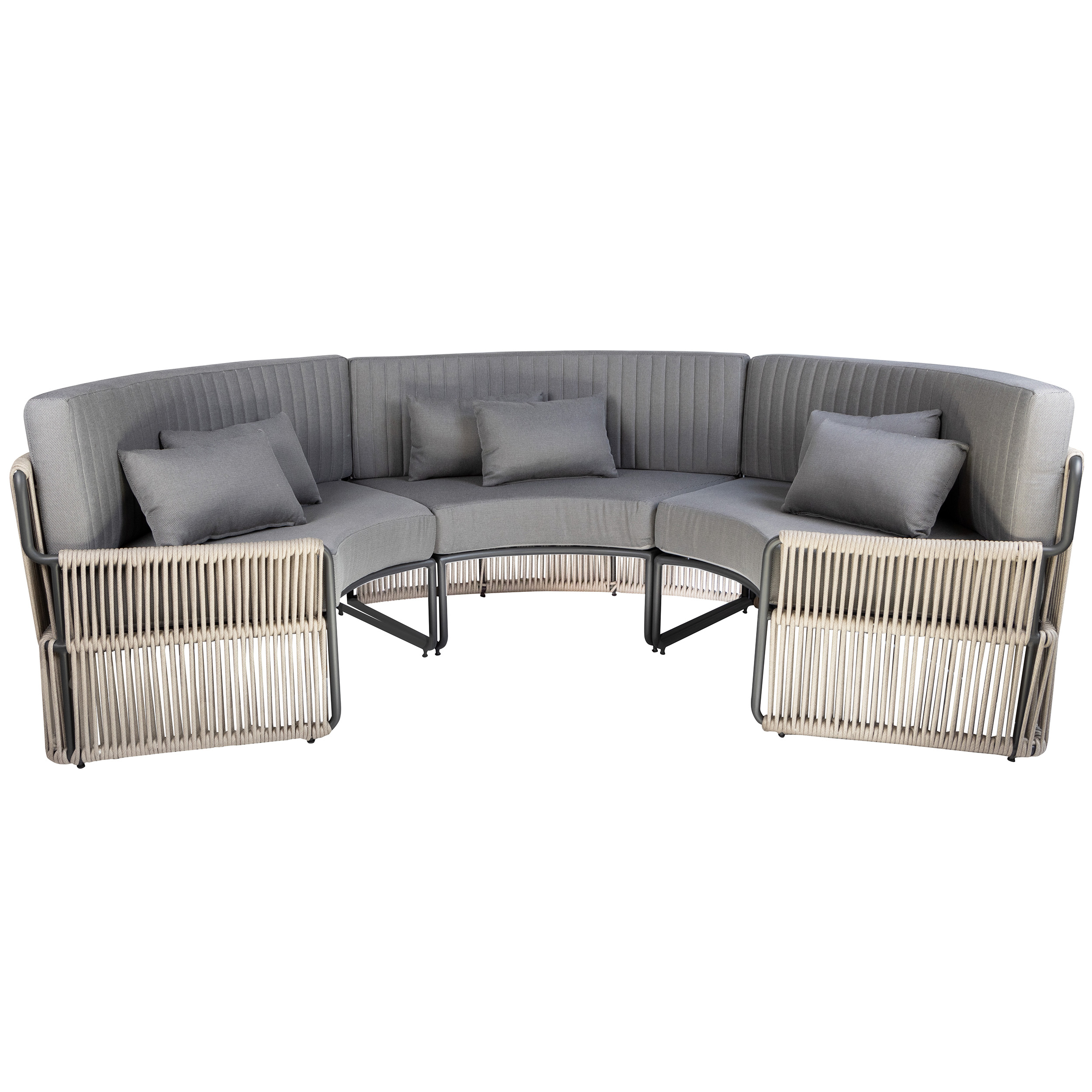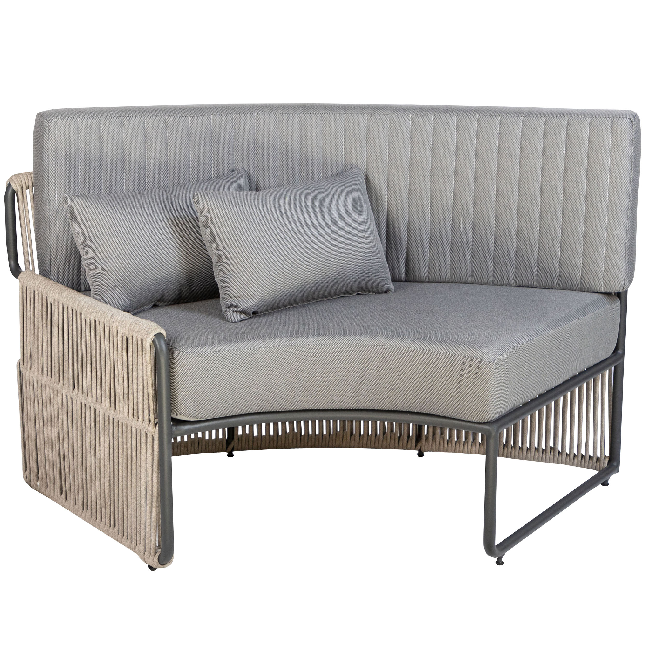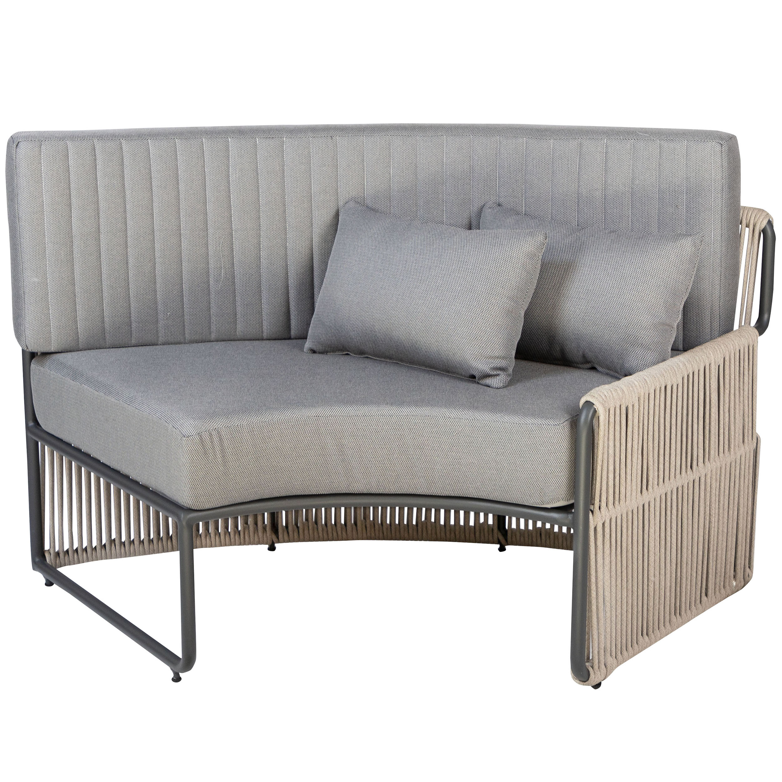 The Roma Lounge Bench Small consists of three bench elements that together form a cosy semi-circular seat. These elements feature a sturdy powder-coated aluminium frame. Thanks to the powder coating, the frame is scratch-resistant and low-maintenance! The Roma Lounge Sofa comes with thick cushions covered in grey Olefin upholstery. This fabric feels wonderfully comfortable, is UV-resistant and dirt-resistant. Perfect for professional use, therefore!