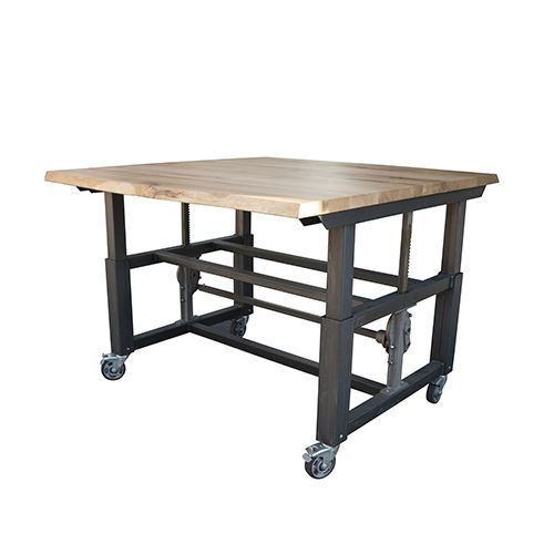 The Trunk table features a sturdy metal frame with oak top.