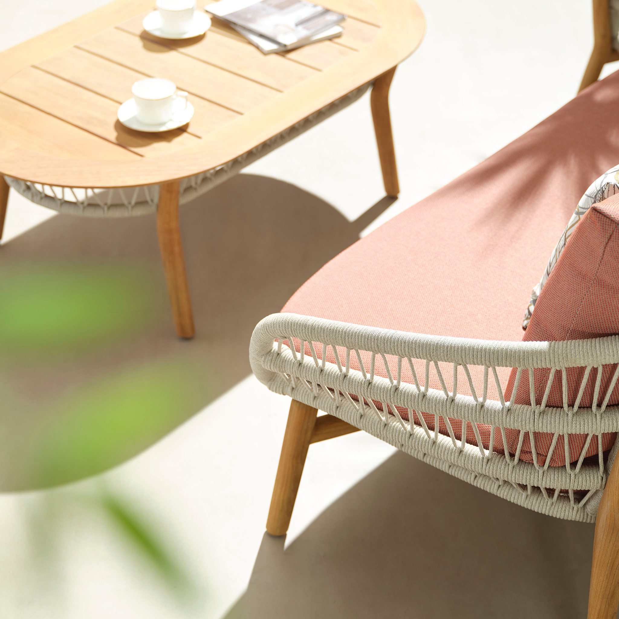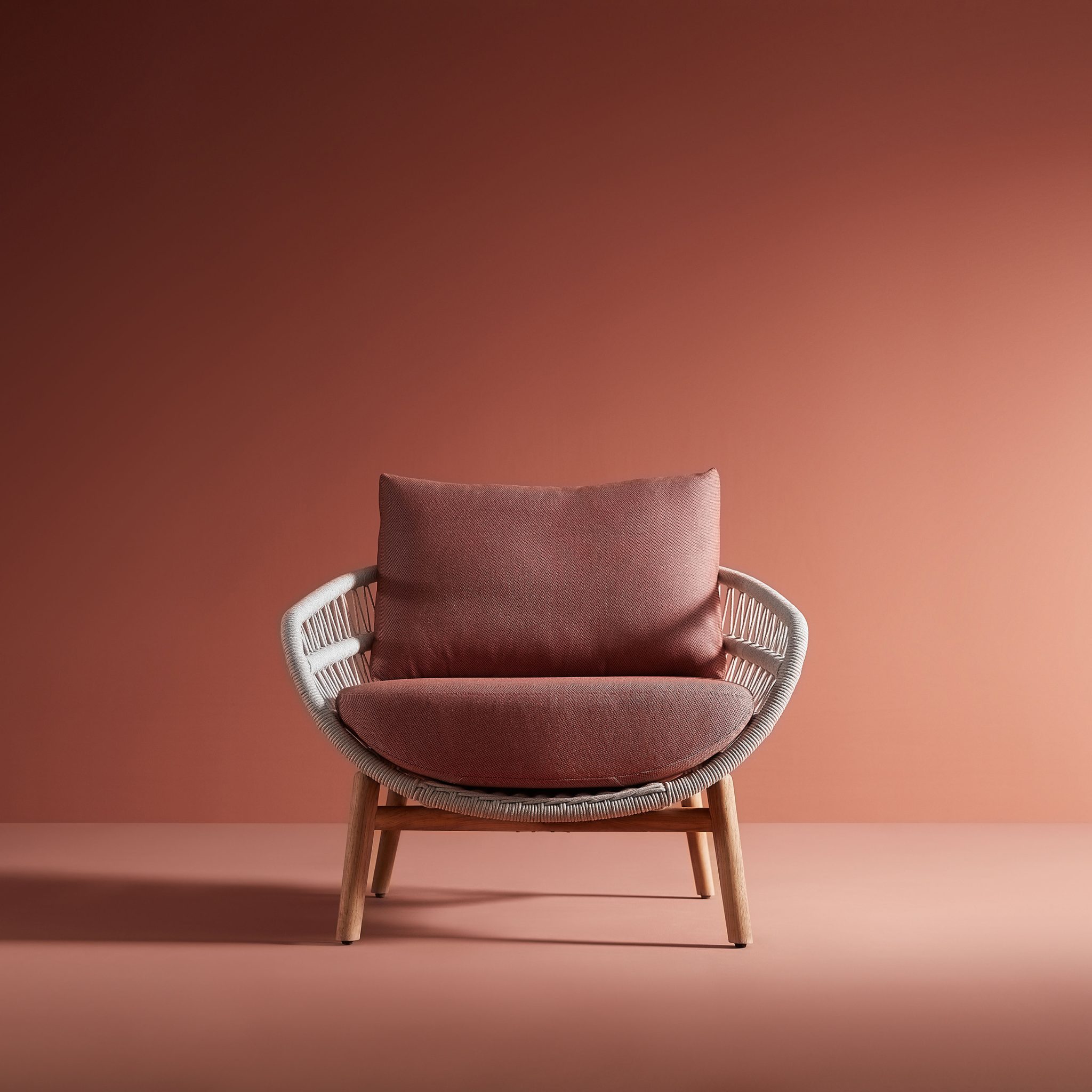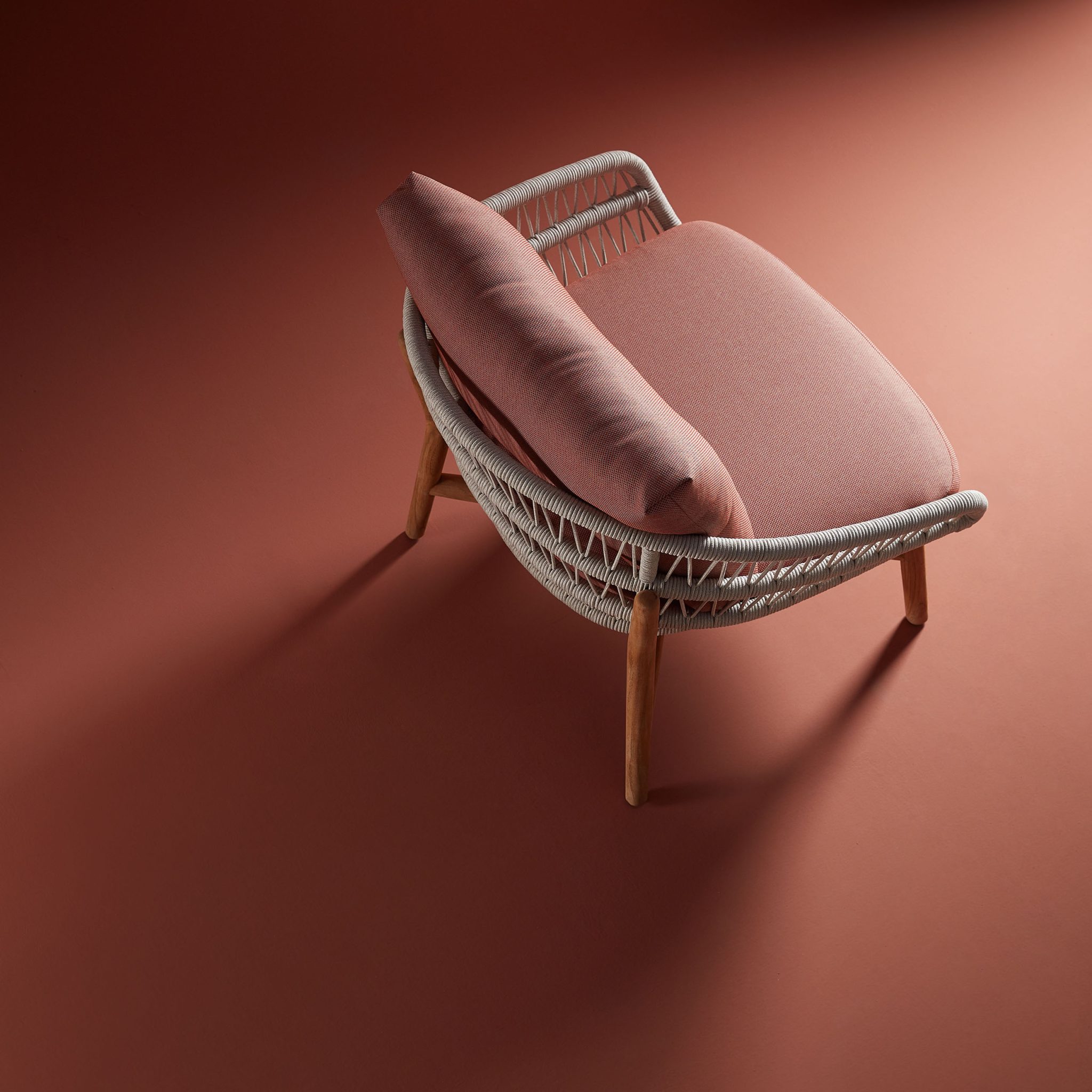 The Vasca Lounge Set – Red by Higold is a luxurious set consisting of a two-seater lounge sofa, two lounge armchairs and a coffee table. Higold Excellent Outdoor is known for using high-quality materials and unique designs. Designed by Claudio Bellini, the Vasca Collection is inspired by the long summer days. The woven structure of the collection looks airy and leaves the feeling of well-being and lightness. The perfect mix at the end of a demanding day. The round shapes and soft cushions create harmony and a sense of calm. The wooden components bring back a warm and soft atmosphere.