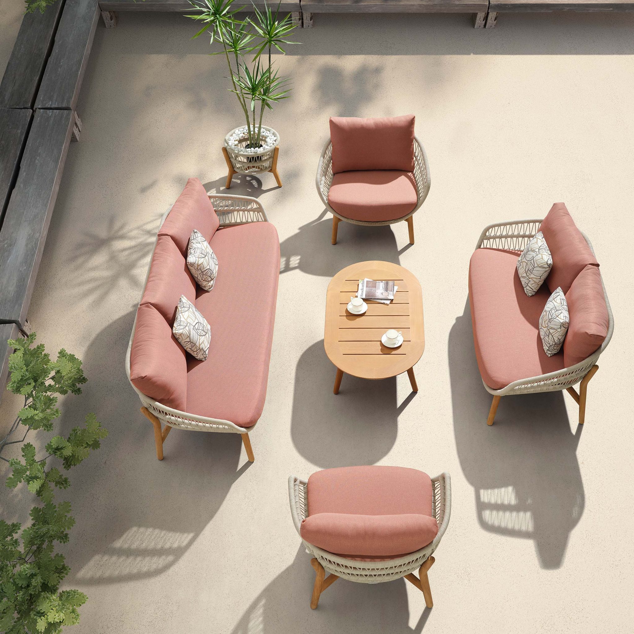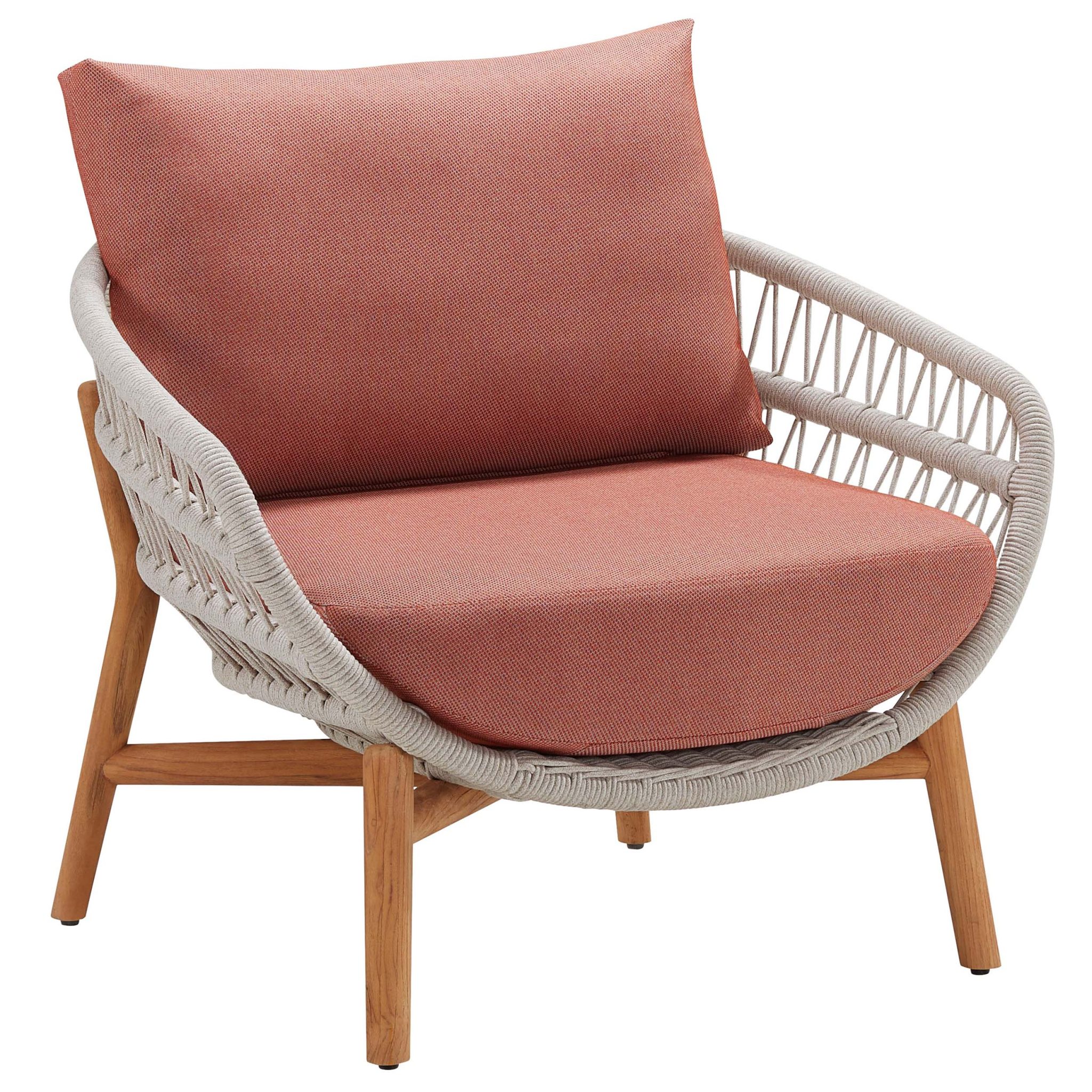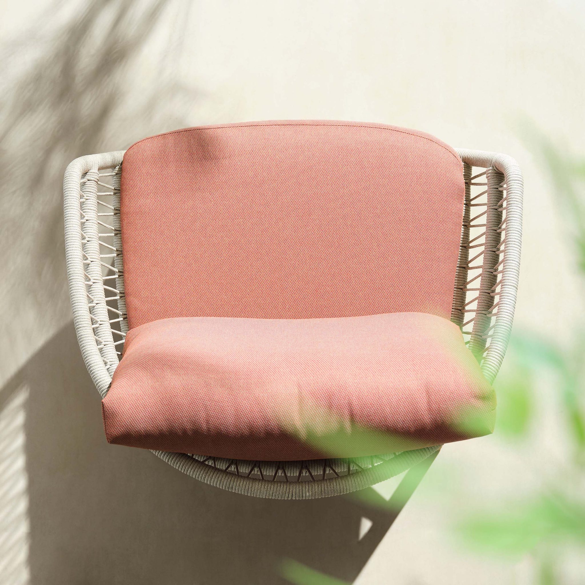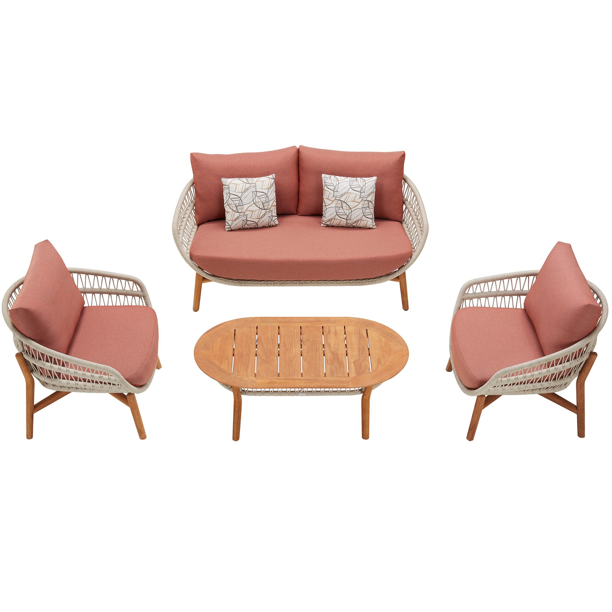 The Vasca Lounge Set – Red by Higold is a luxurious set consisting of a two-seater lounge sofa, two lounge armchairs and a coffee table. Higold Excellent Outdoor is known for using high-quality materials and unique designs. Designed by Claudio Bellini, the Vasca Collection is inspired by the long summer days. The woven structure of the collection looks airy and leaves the feeling of well-being and lightness. The perfect mix at the end of a demanding day. The round shapes and soft cushions create harmony and a sense of calm. The wooden components bring back a warm and soft atmosphere.