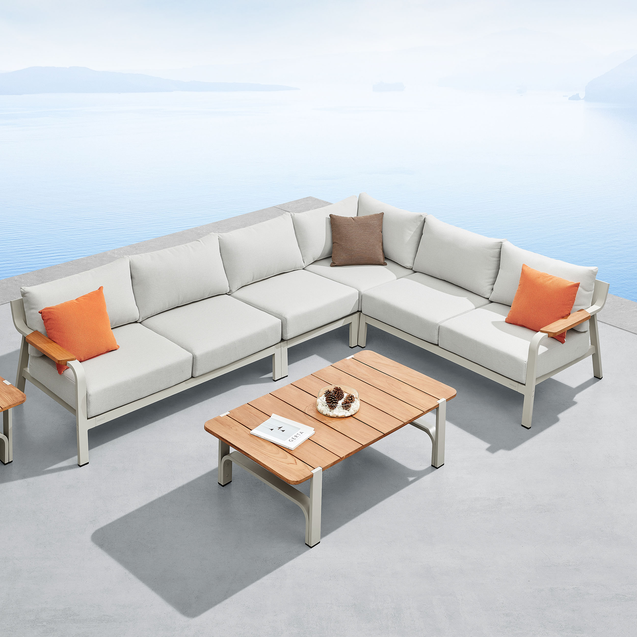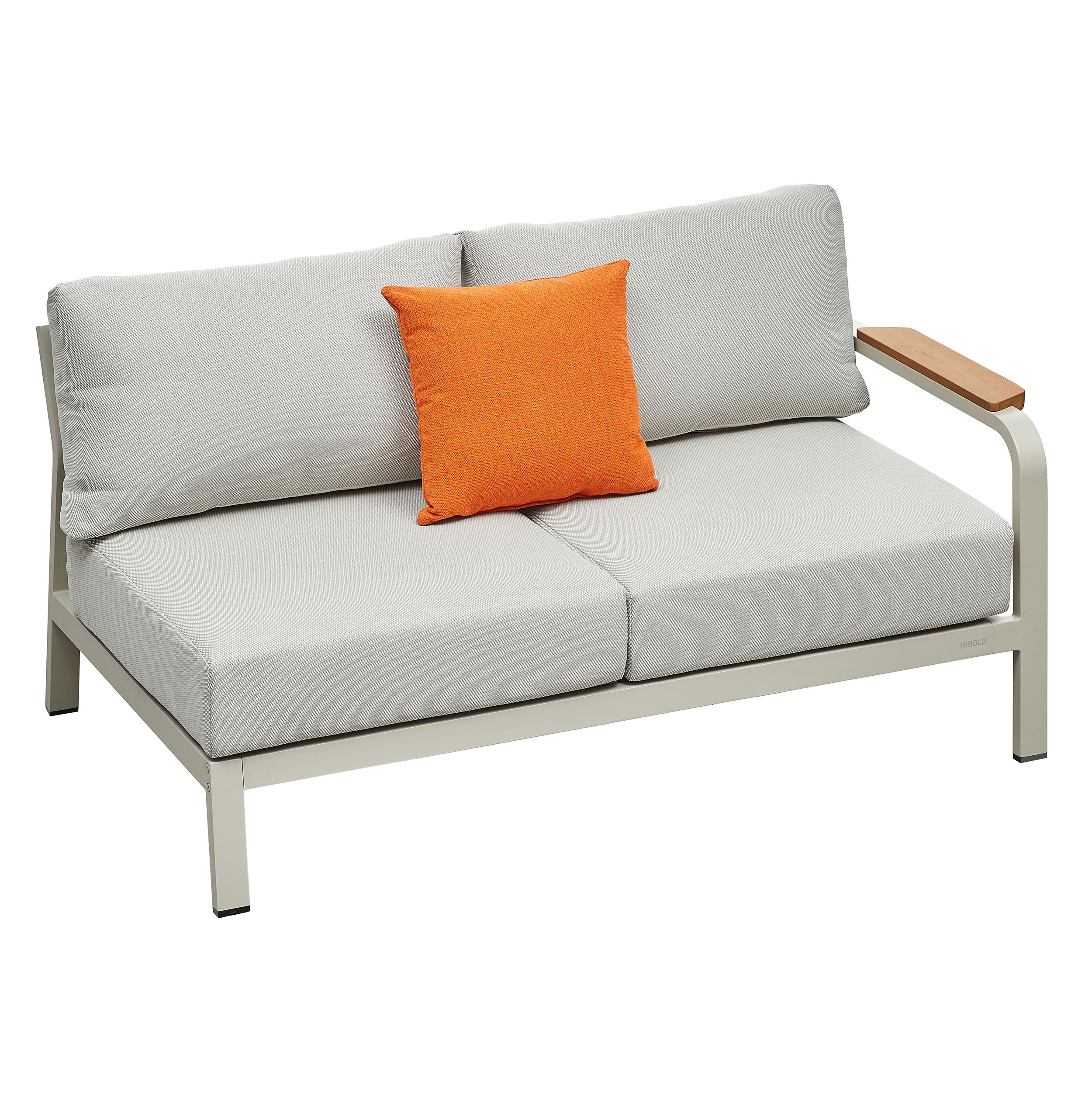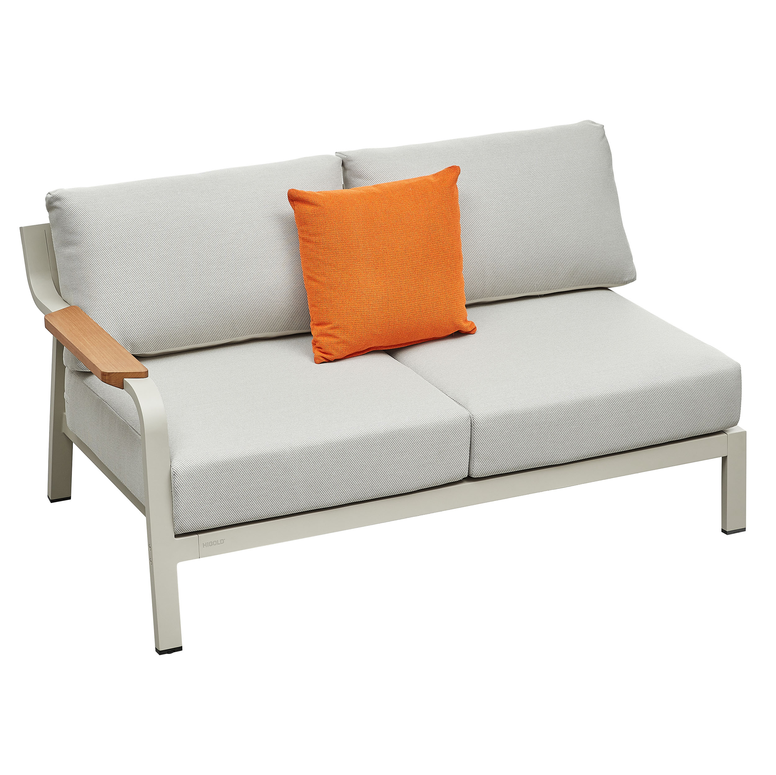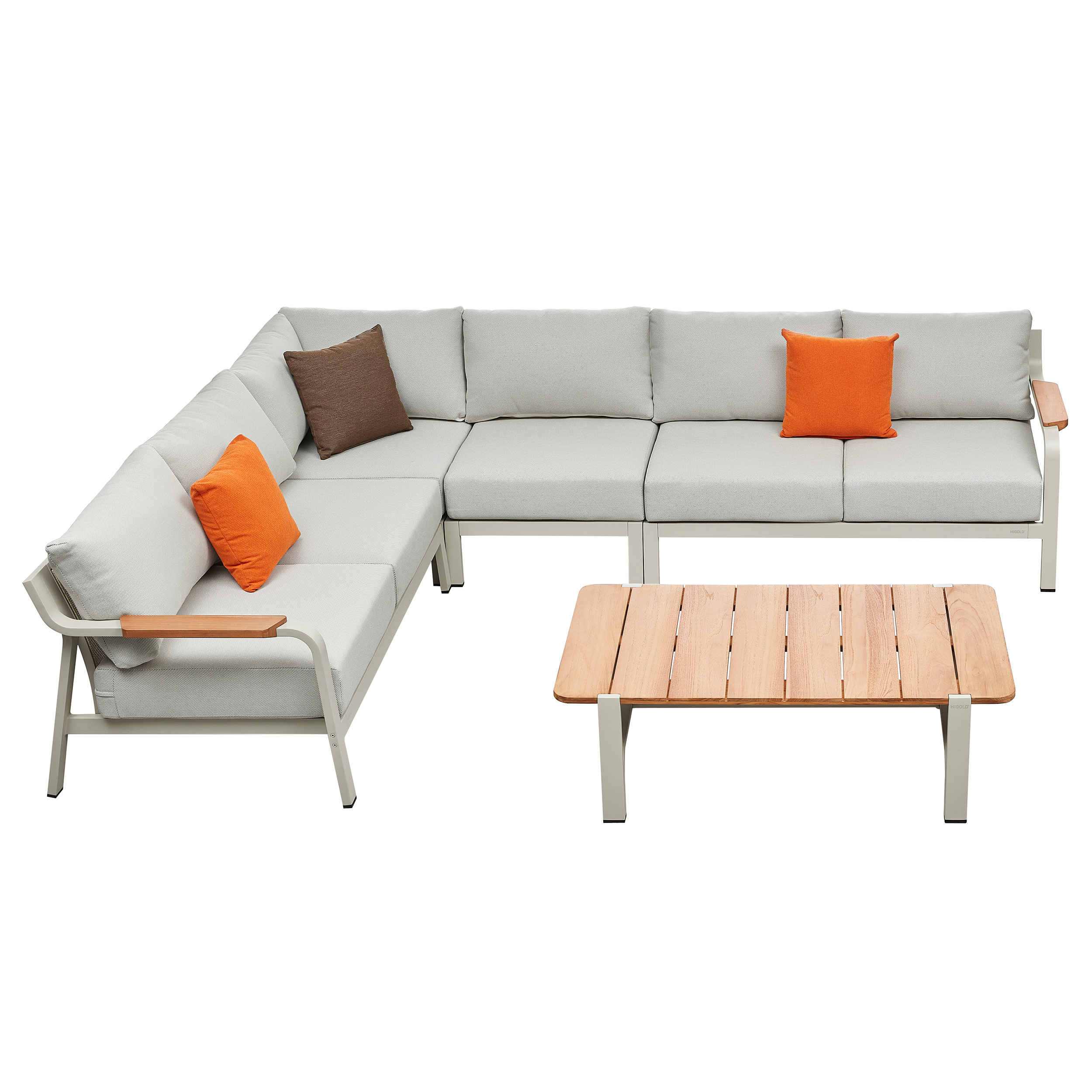 The Visconti Corner Lounge by Higold is a stylish set consisting of four sofa elements, a side table and a luxurious coffee table. Higold Excellent Outdoor is known for its use of high-quality materials and unique designs. The Visconti Collection is characterised by its modern look, sturdy aluminium frame, teak elements and large luxurious cushions upholstered with Olefin.