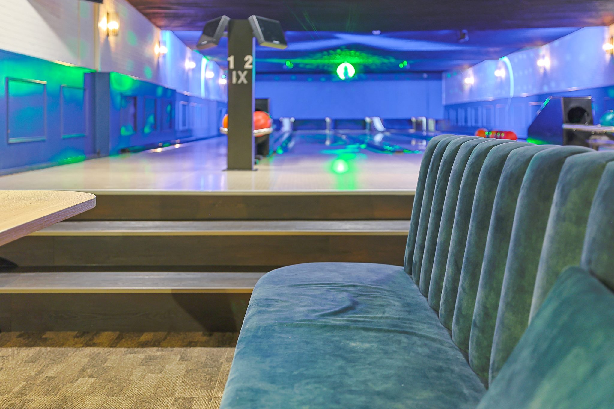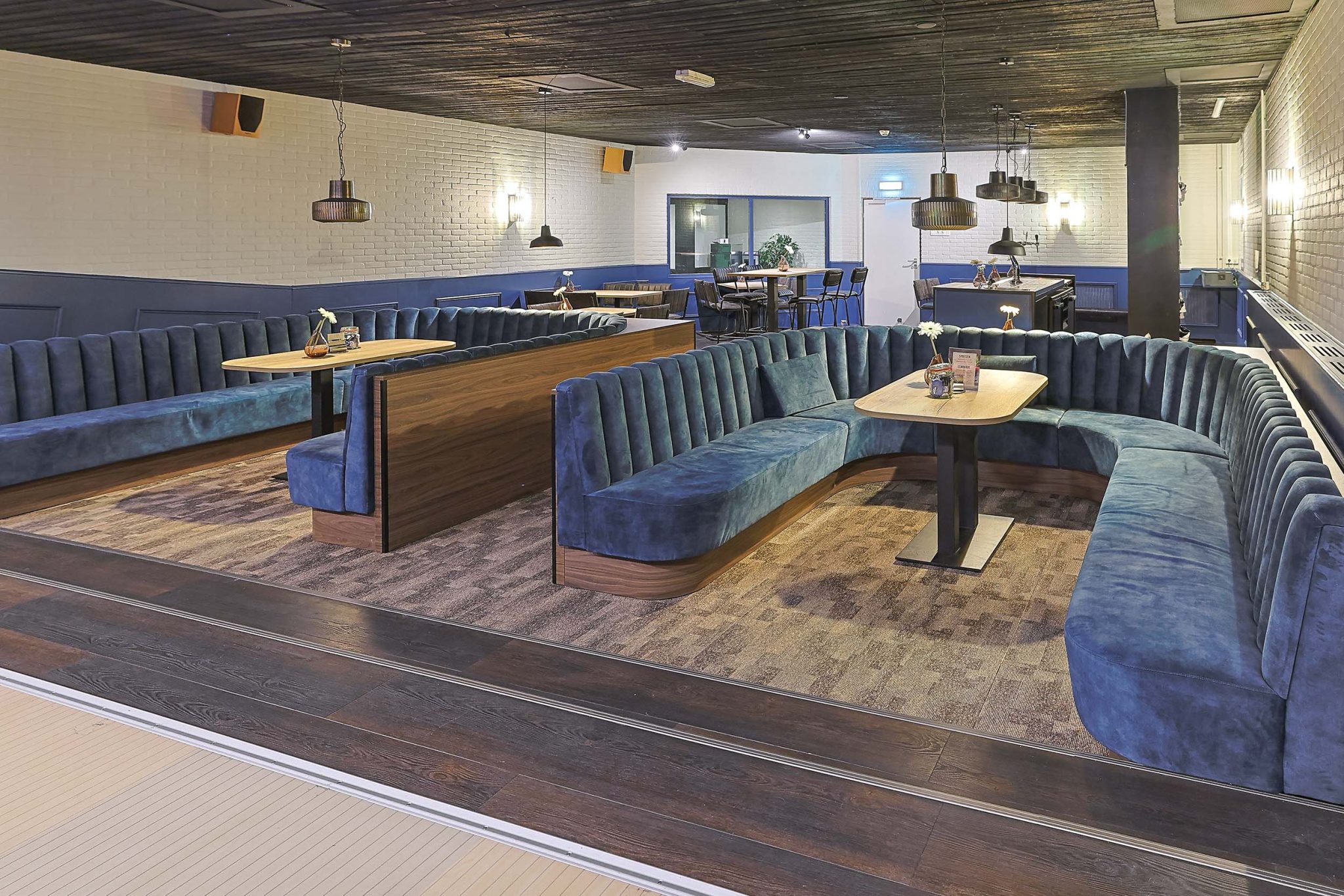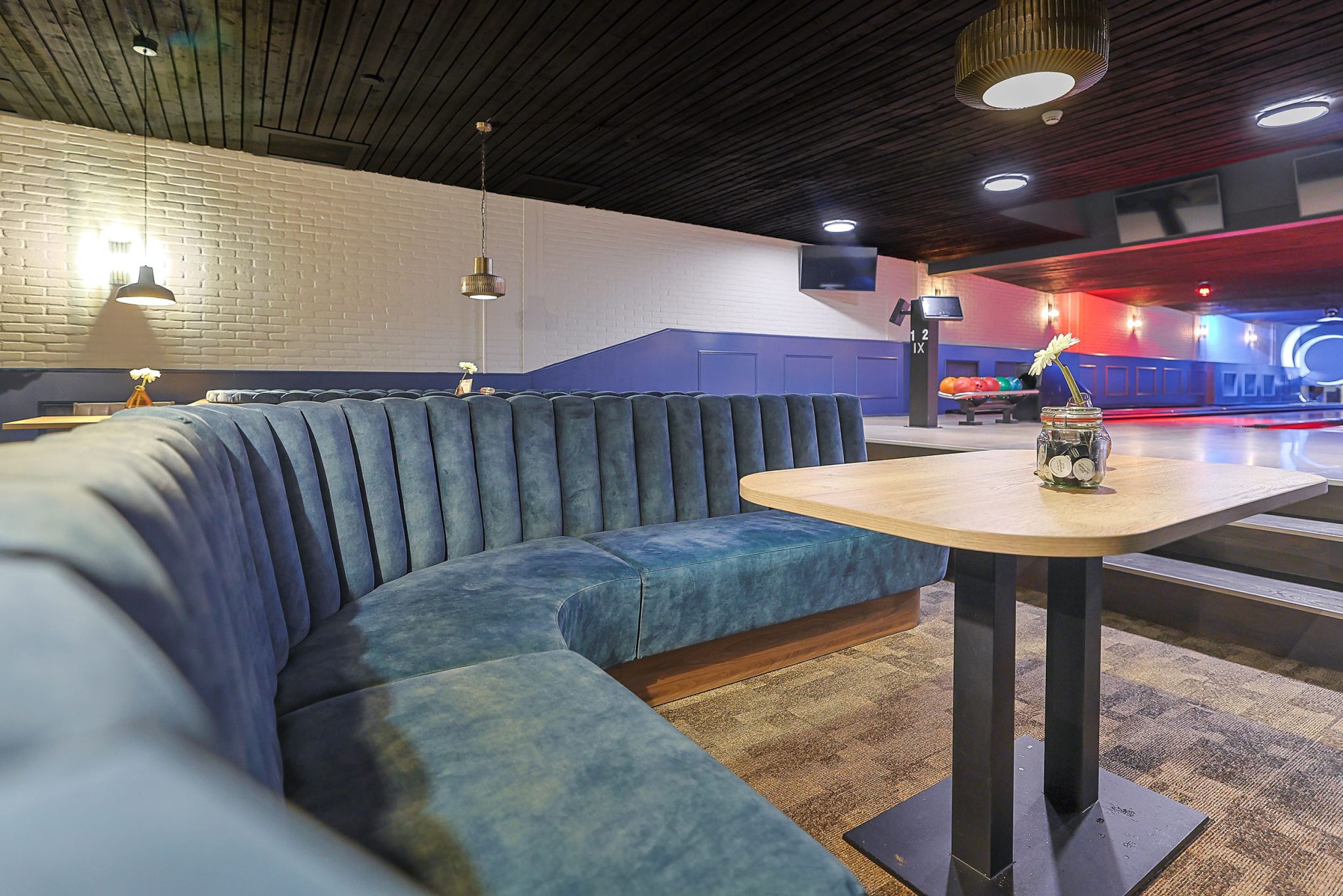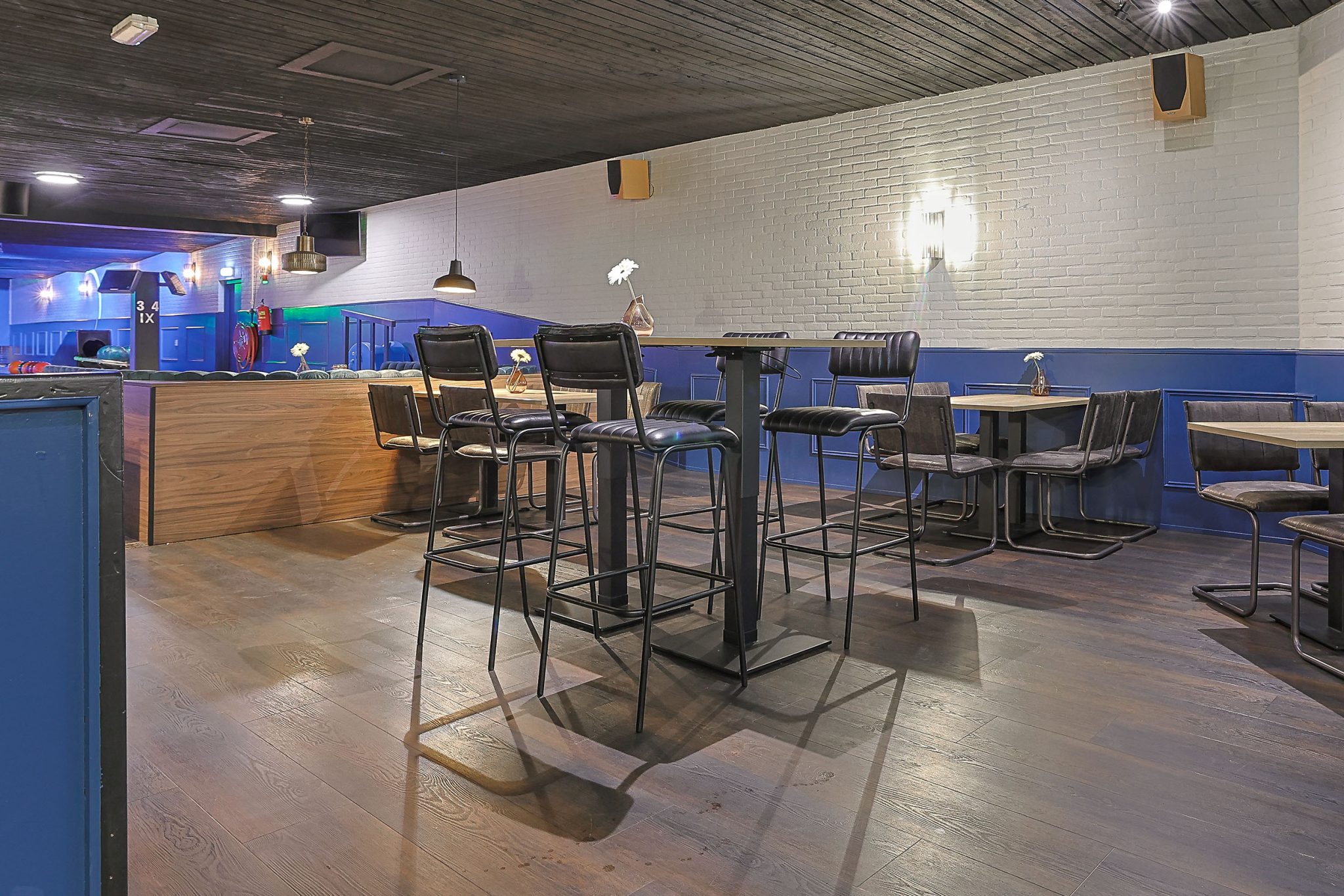Among the furniture used for the realisation of the bowling alley’s interior are table base Rivas black, table top Melamine T600 Oak Natural and the Jimi Bench in black leather.