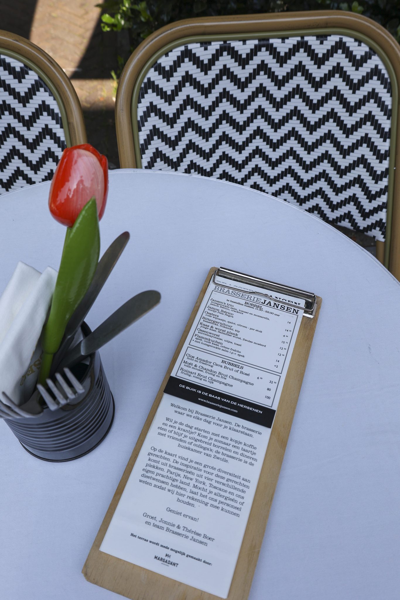 In the heart of Zwolle, you will find the cosy and atmospheric Brasserie Jansen. The menu features delicious dishes with influences from Paris, New York, Tuscany and, of course, the Netherlands. Come and enjoy a cup of coffee, lunch or dinner. The terrace is decorated by Kaja Interiors.